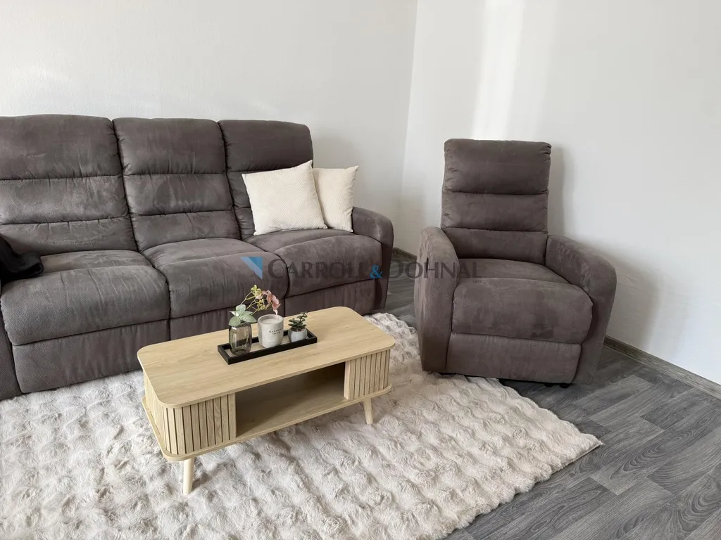 Obývací část je laděná do příjemných, neutrálních barev, které uklidňují a zároveň působí moderně. Pohodlná sedačka vybízí po dlouhém dni k odpočinku a prostor je doplněn o postel.