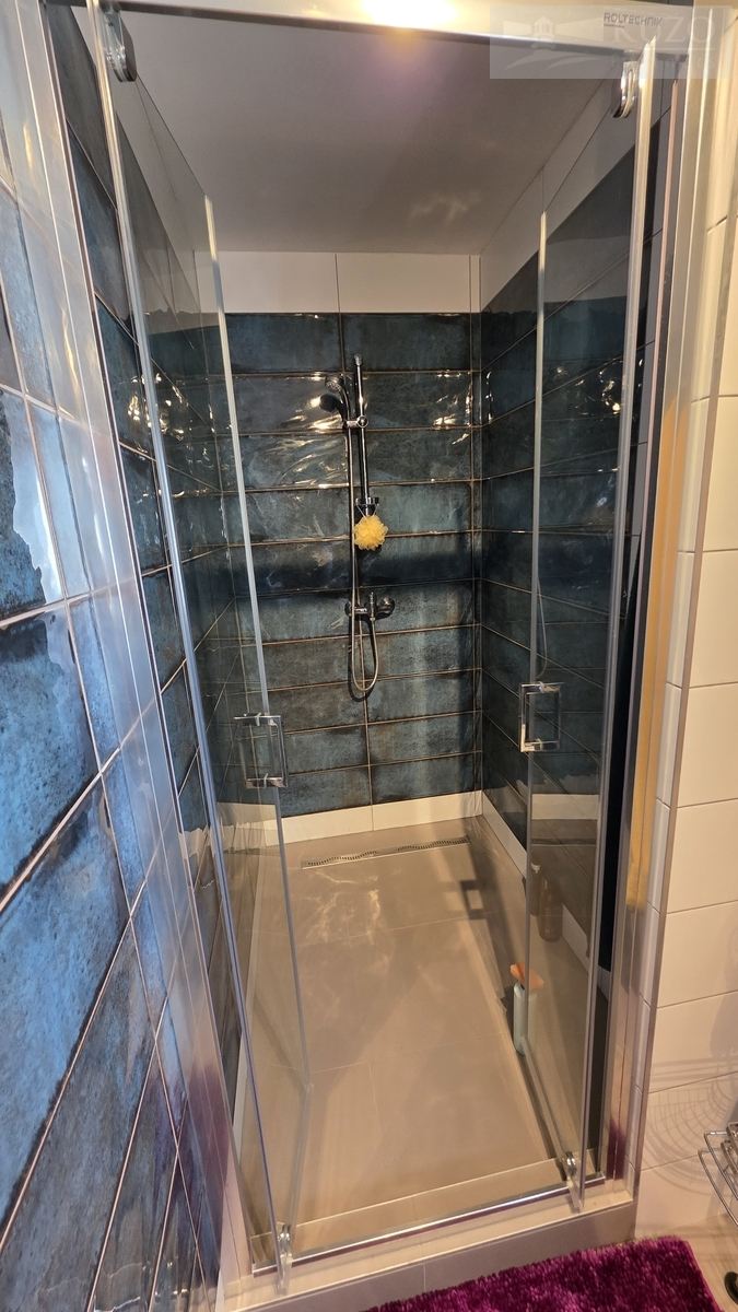 Skutečnou dominantou bytu je luxusní koupelna s oknem, které zajišťuje přirozené denní světlo a perfektní větrání. Je vybavena designovými italskými obklady s efektem metalické oxidace v petrolejovém odstínu, které v kombinaci s dřevěným dekorem nábytku vytvářejí moderní a hřejivou atmosféru.
