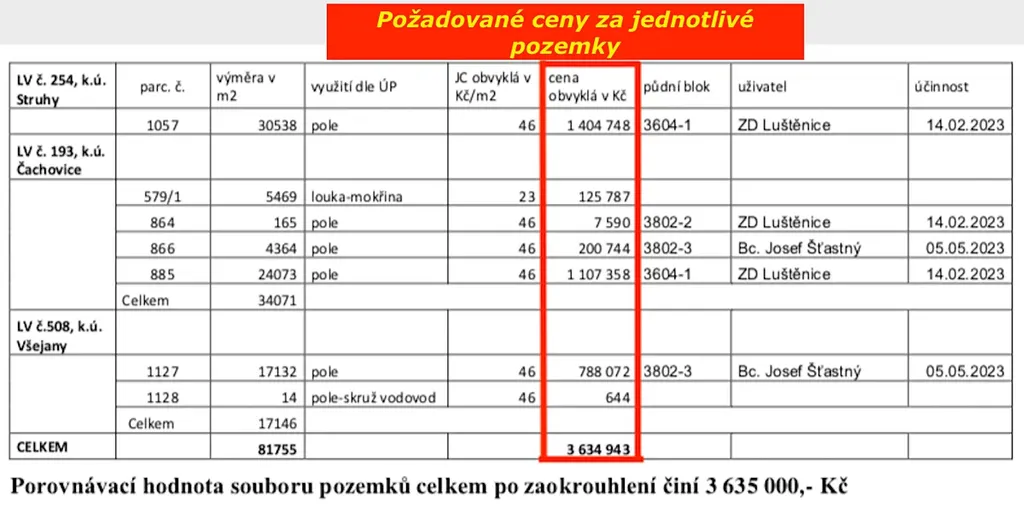 Ale lze samozřejmě podat nabídku i na jednotlivé pozemky, dle přiložené tabulky, kde jsou uvedeny požadované ceny za jednotlivé polnosti.