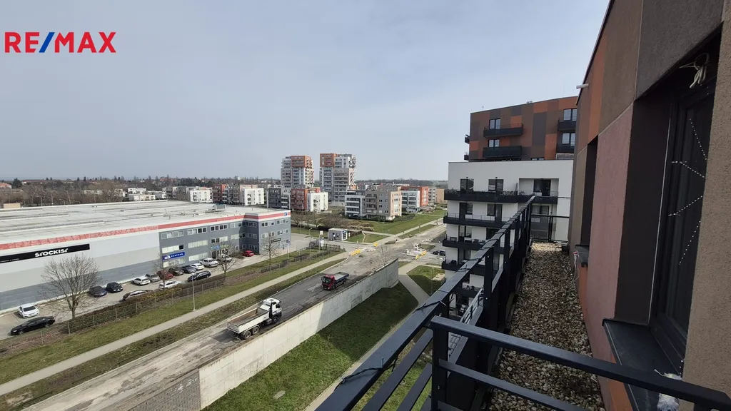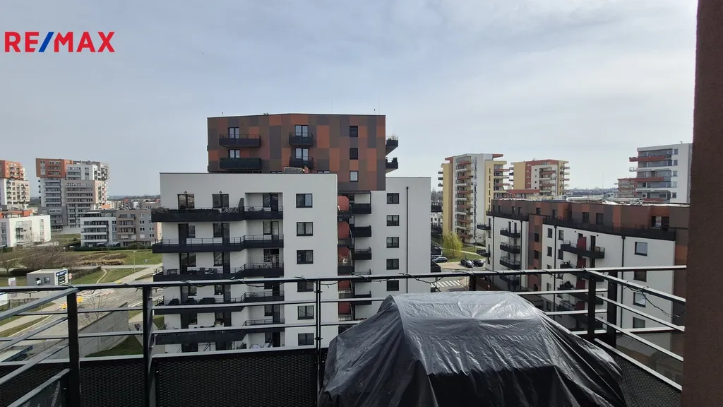 Byt se nachází v 7. patře (nejvyšším) domu s výtahem, bezbariérovým přístupem a nabízí výhledy do okolí. Celková podlahová plocha bytu je 83,7 m² a k dispozici jsou dvě terasy 3,3m2 a 6,9m2 , sklep 3,5m2 a garážové stání.