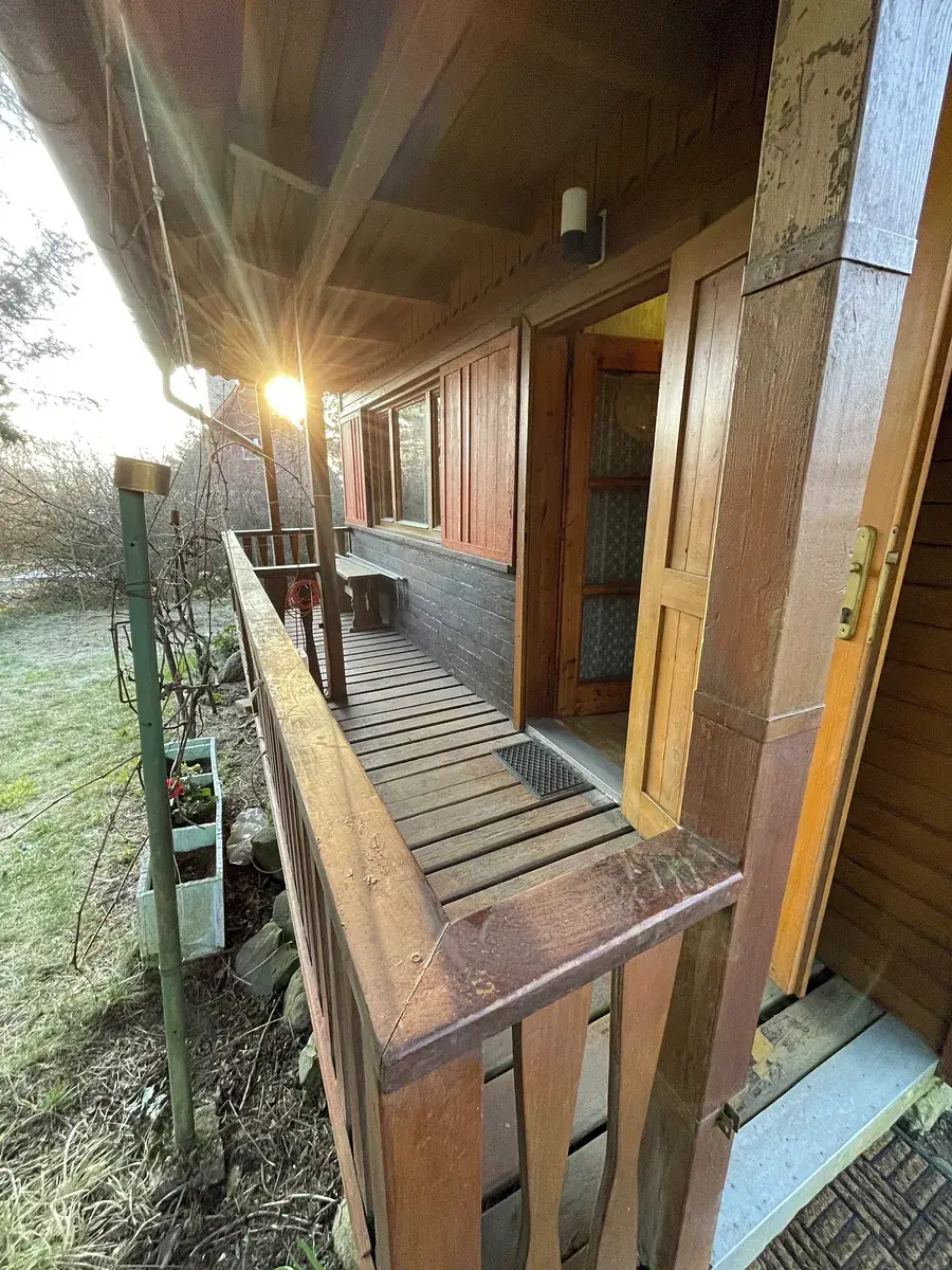 - dřevěná budova se zastřešenou verandou a nižší podezdívkou