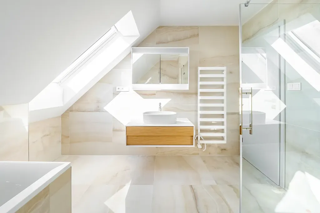 Koupelny jsou řešeny v moderním designu s velkoformátovými obklady, vanou i sprchovým koutem a kvalitní sanitou, což zajišťuje vysoký komfort každodenního bydlení.