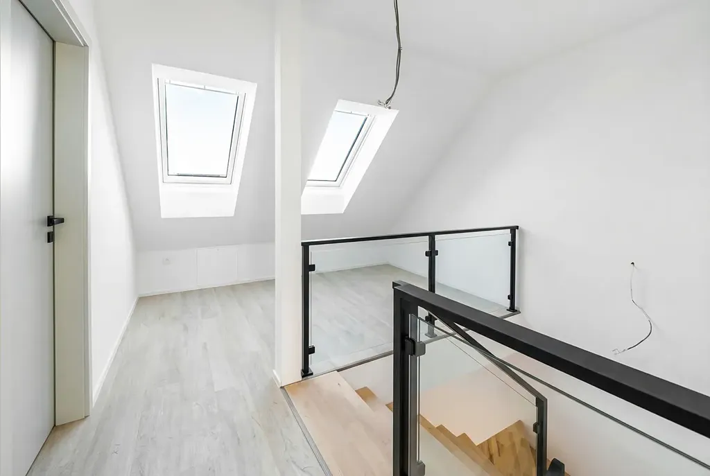 Dispozice bytu je prakticky řešena a nabízí vstupní chodbu, prostorný obývací pokoj s přípravou na kuchyňský kout, tři samostatné pokoje, dvě koupelny a vnitřní schodiště, které dodává interiéru moderní a vzdušný charakter. Umístění bytu v podkroví spolu se střešními okny zajišťuje dostatek přirozeného světla a příjemnou atmosféru v celém prostoru.