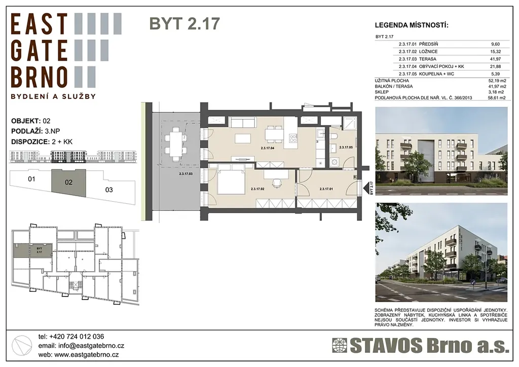 Byt se nachází ve druhém podlaží budované novostavby s plánovaným dokončením v roce 2027. Díky výtahu a bezbariérovému přístupu je vhodný i pro osoby se sníženou pohyblivostí. Jedná se o byt s užitnou plochou 52 m2, k němuž náleží prostorná terasa o rozloze 42 m2 a sklep s plochou 3 m2. Navržená dispozice bytu nabízí dostatek prostoru pro pohodlné bydlení. Nyní je objekt ve výstavbě a to dává budoucím majitelům možnost zapojit se do úprav a přizpůsobit si budoucí domov podle svých představ.