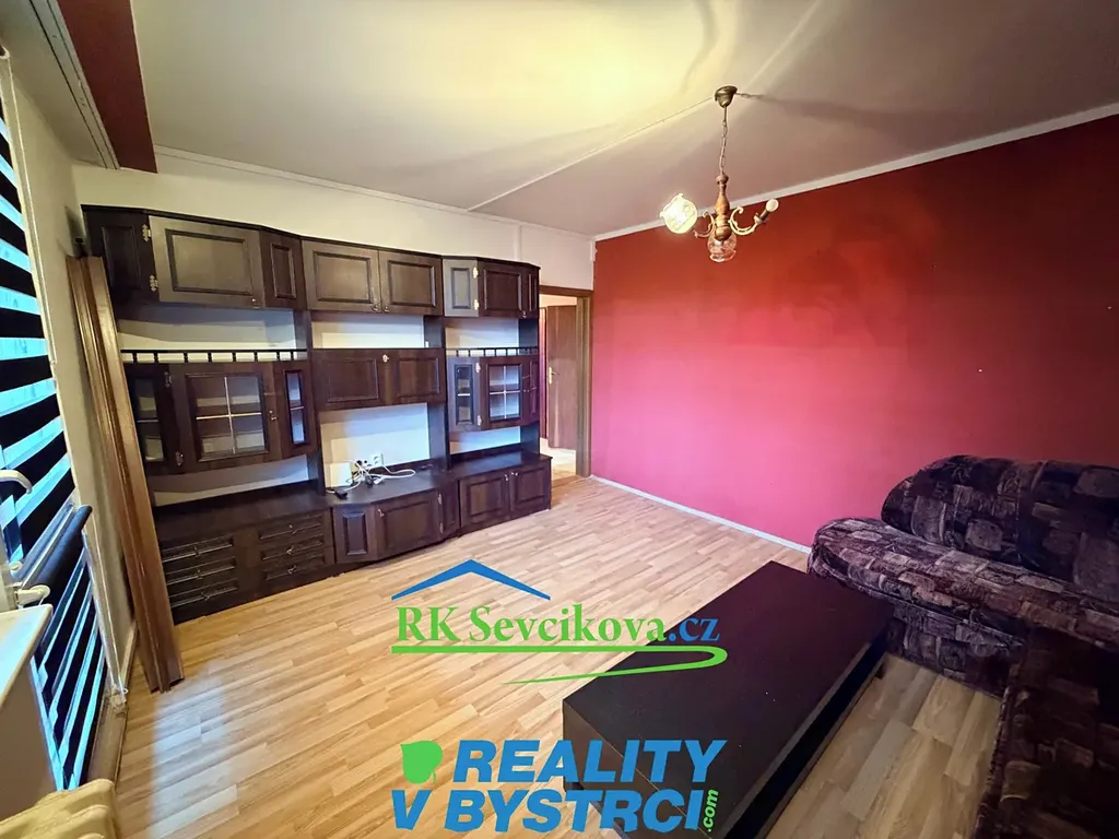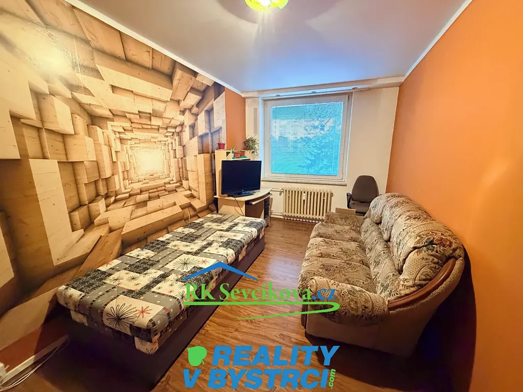 V obývacím pokoji se nachází rozkládací sedací souprava, nábytková stěna a konferenční stolek.