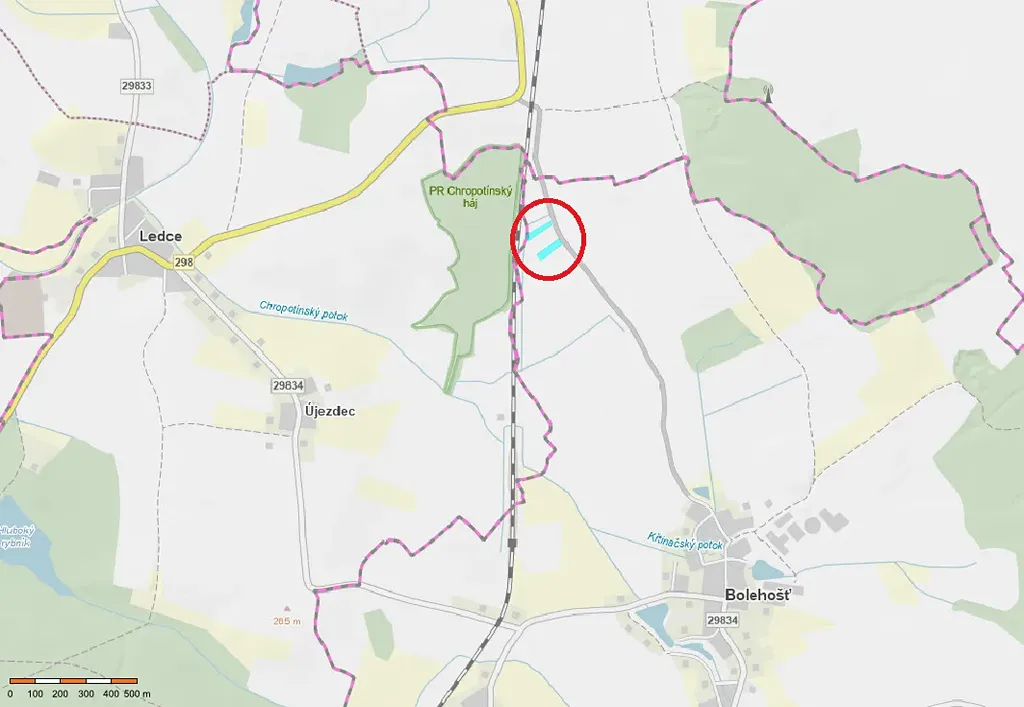 Prodávané parcely číslo 533/2, 533/17, 533/25, 534, 704, 858 v katastrálním území Ledce vedené na listu vlastnictví číslo 44 mají společnou výměru 158.003 m2.