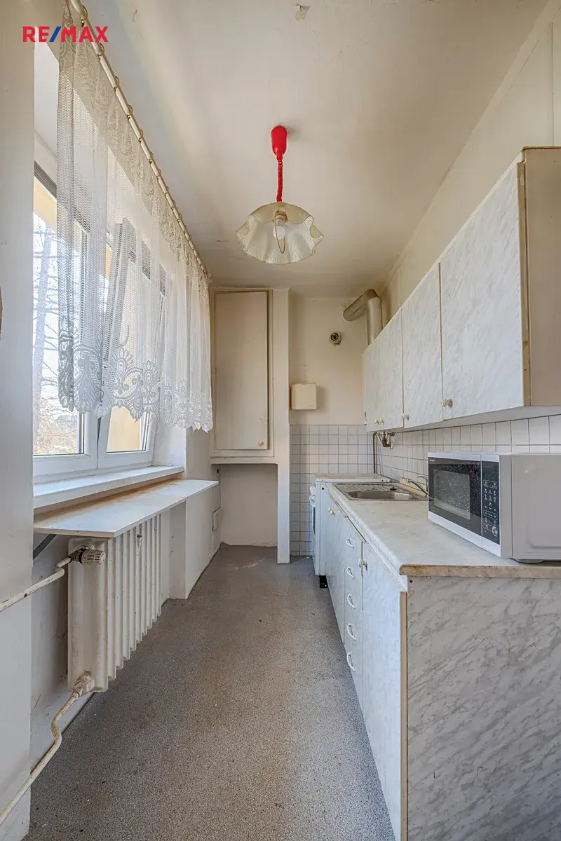 Byt je v původním stavu a určen k rekonstrukci. V obytných místnostech jsou parkety, v chodbě a kuchyni je položena dlažba. Vytápění je řešeno ústředním dálkovým topením. Součástí bytu je také plynový ohřívač vody, který však v současnosti není využíván. Pro lepší představu o dispozici je ve fotogalerii k dispozici půdorys bytu.