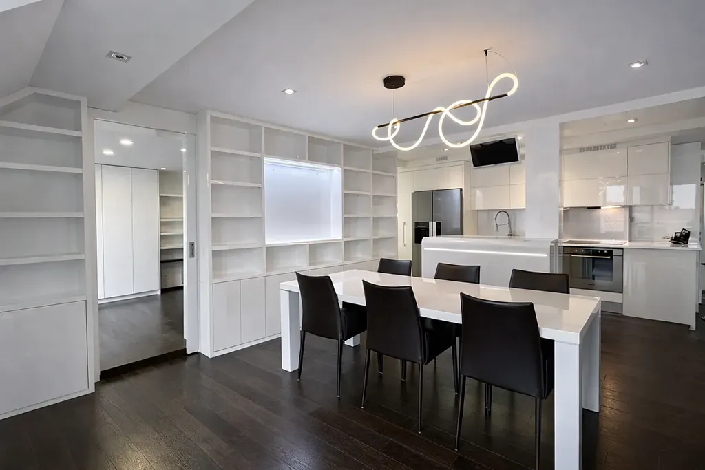 Byt se pyšní panoramatickým 360° výhledem na celou Prahu a prošel kompletní renovací před šesti lety. Po vstupu do bytu vás přivítá předsíň, ze které se po několika schodech dostanete do soukromého wellness se saunou. Hlavní obytný prostor tvoří prostorný obývací pokoj s mramorem obloženým krbem a plně vybavenou kuchyní značky Miele, kde stěny zdobí elegantní benátský štuk. Snídaně si můžete vychutnat na jednom ze dvou balkonů s působivým výhledem na historické památky Starého Města.