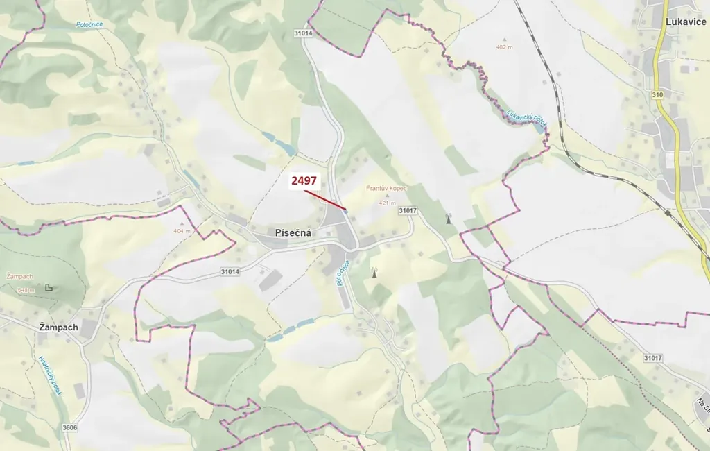 Lesní pozemek o výměře 797 m2, parcelní číslo 2497, podíl 1/1, katastrální území Písečná u Žamberka, obec Písečná, obec s rozšířenou působností Žamberk, okres Ústí nad Orlicí, Pardubický kraj.