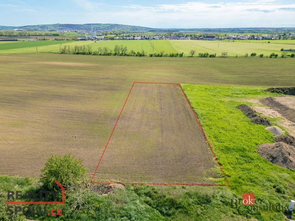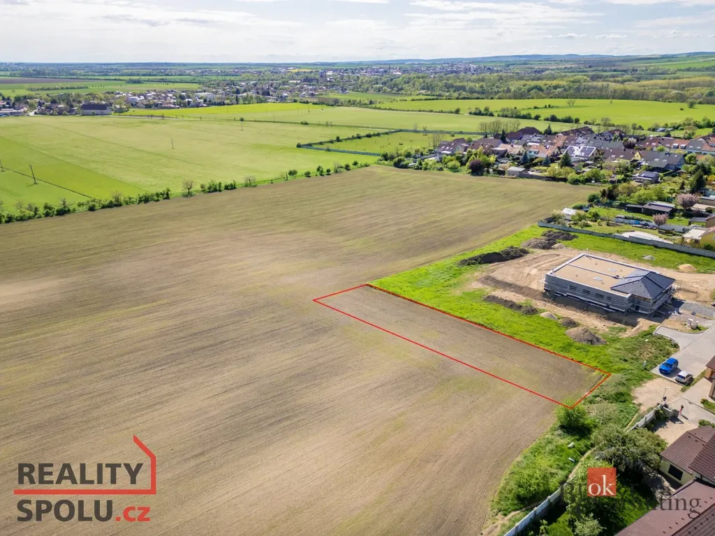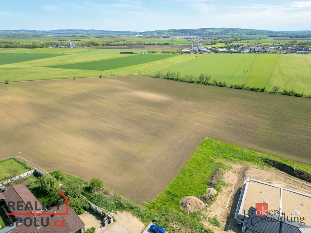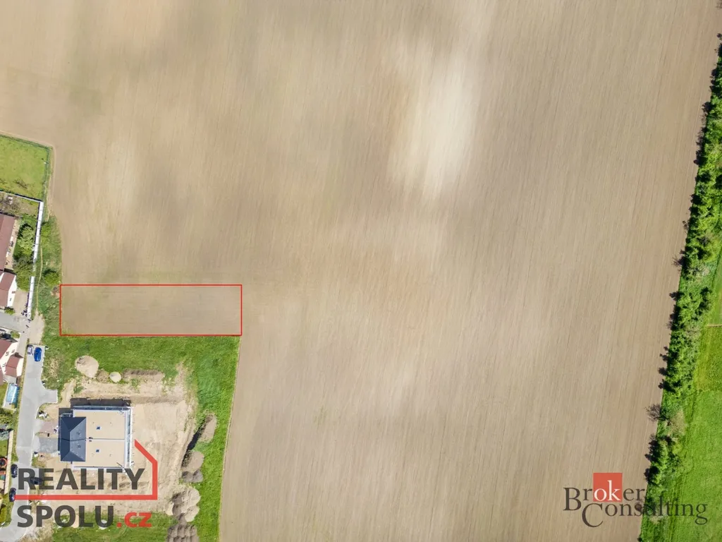 Celková výměra pozemku je 4917m2, z čehož 1300 m2 (červeně vymezená část na fotkách) je stavební část a ostatní plocha je orná půda. Pozemek disponuje krásným výhledem do okolní krajiny. Nespornou výhodou pozemku je jeho šíře, která činí cca 20m a také jeho lokace v zadní částí nové výstavby.