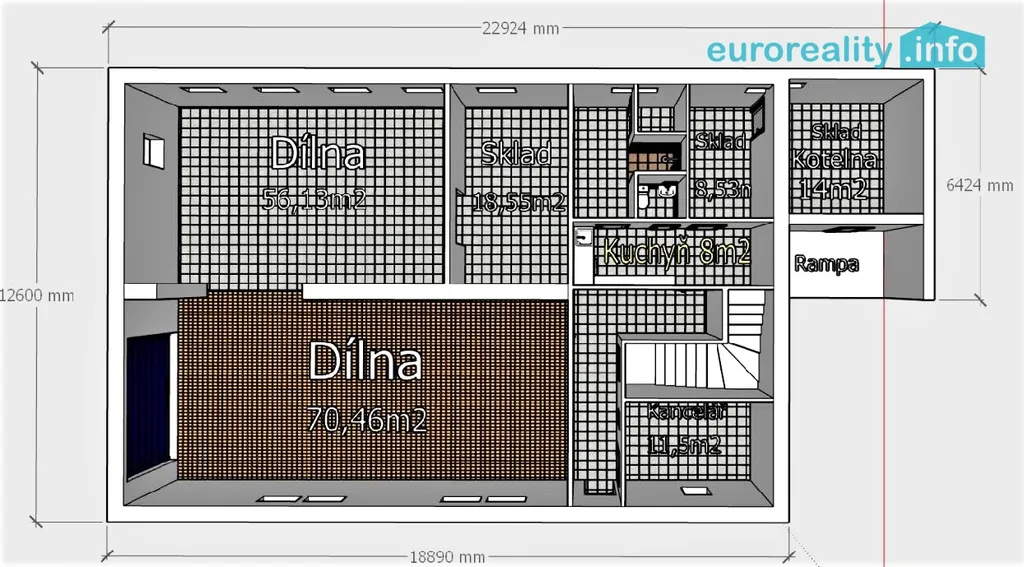 Přízemí je využíváno jako již zmíněná autodílna, schody je spojeno s prvním patrem, které je připraveno na podkrovní bydlení.