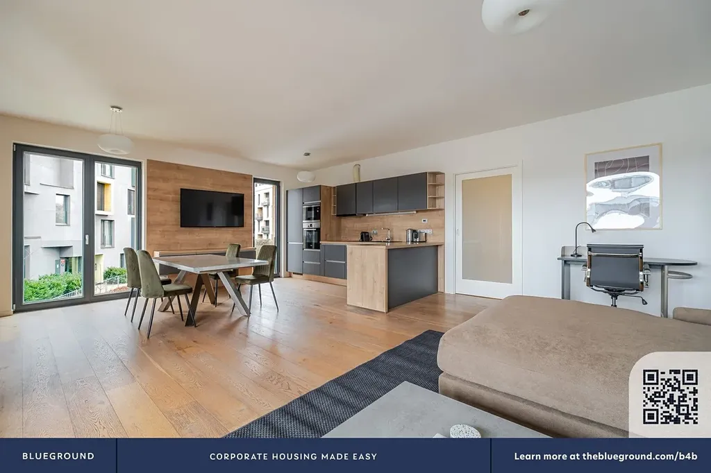 Blueground nabízí stylový, plně zařízený byt 3+kk s plně vybavenou kuchyní k pronájmu v Praze 8, Palmovka.