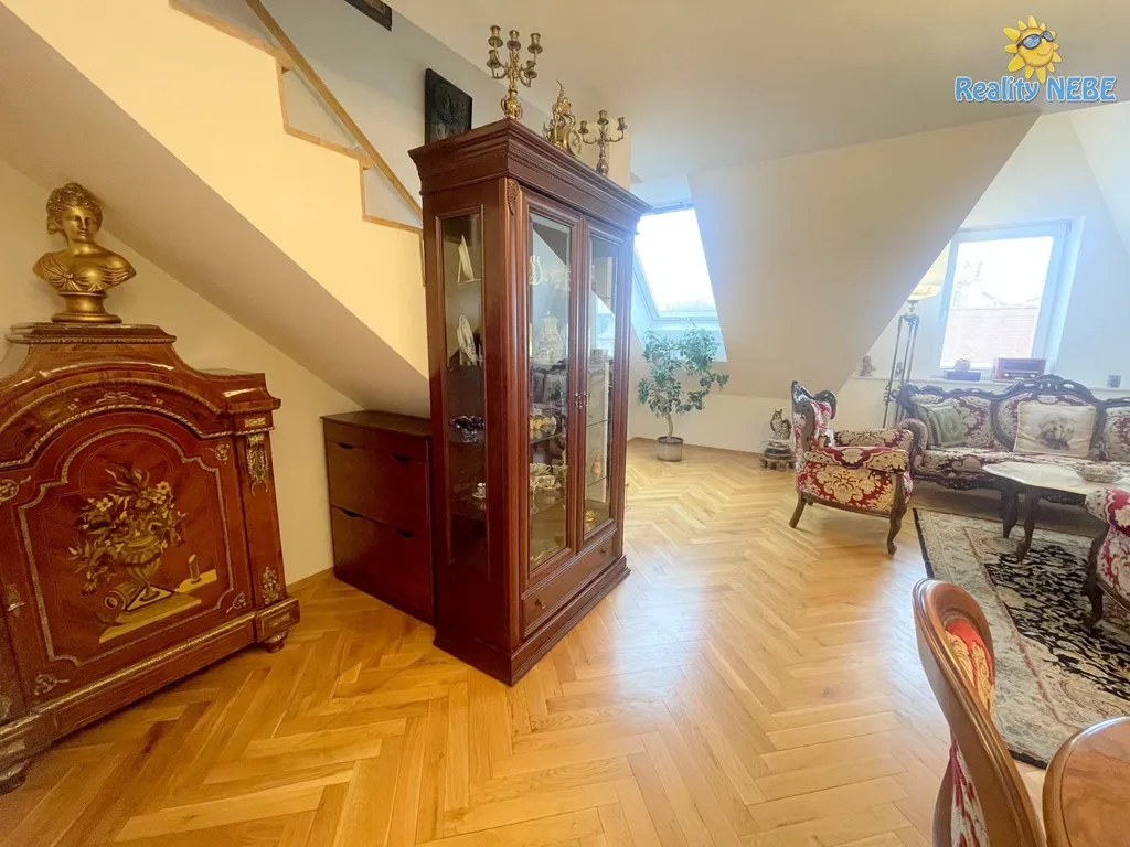 Po schodech nahoru se dostaneme do pokojíku, koupelny s rohovou vanou, sprchou, umyvadlem, toaletou, technické místnosti (kotel Junkers) s pračkou a do prostorné ložnice s manželkou postelí, klimatizací a vstupem na terasu s výhledem na Prahu. V bytě je 2x trezor. Byt je kompletně vybaven, jen vezmete své věci a bydlíte jak na zámku.