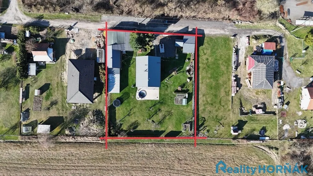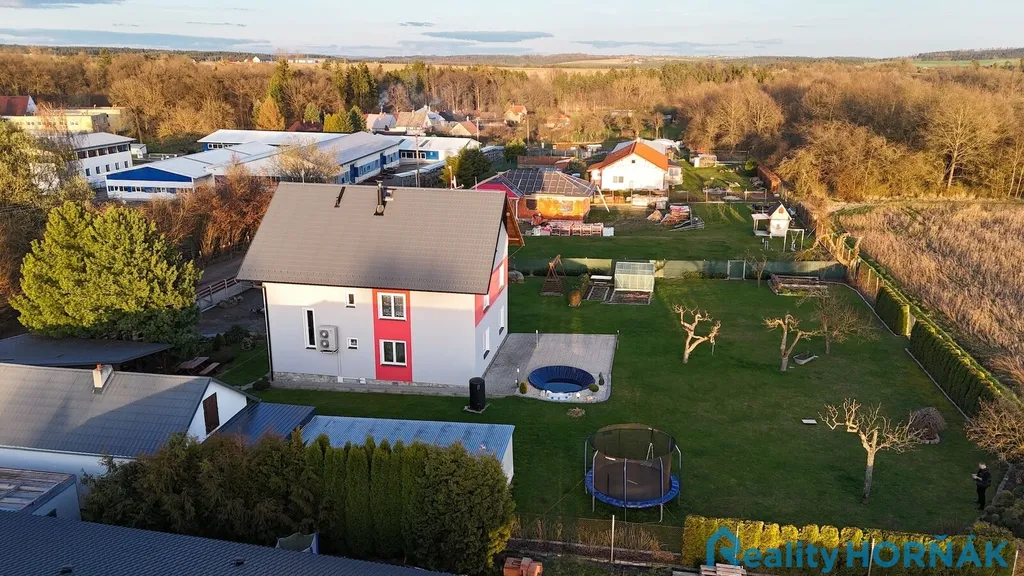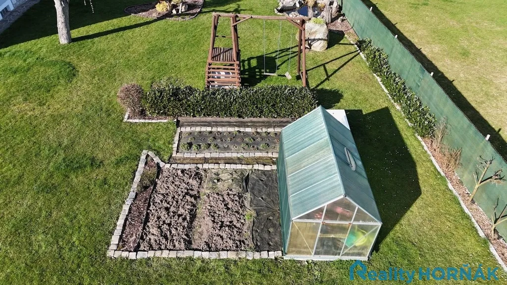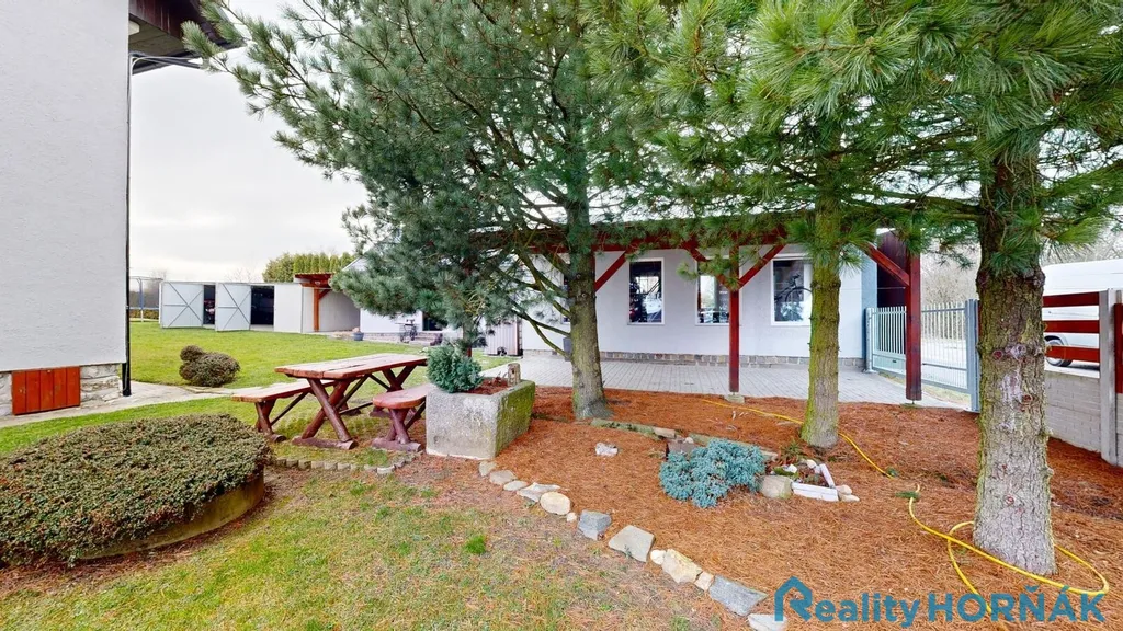 Nabízený rodinný dům je vystavěn na vlastní stavební parcele o výměře 106 m2, obklopené vlastní okrasnou zahradou 1813 m2 se skleníkem, pěstebními záhony a malým jezírkem. Do zpevněné, vydlážděné plochy za domem je zapuštěn kruhový bazén s pískovou filtrací. Při okraji zahrady je vyměřena další stavební parcela (111 m2), která je zastavěna celozděnou autodílnou (s velkými vjezdovými vraty, montážní jámou a půdou pro skladování sezónních věcí), navazujícími garážemi a garážovými stáními. Vlevo od nové vjezdové brány s brankou najdeme šikovný roubený sklad zahradního nářadí s přístřeškem na palivové dříví a káru za auto.