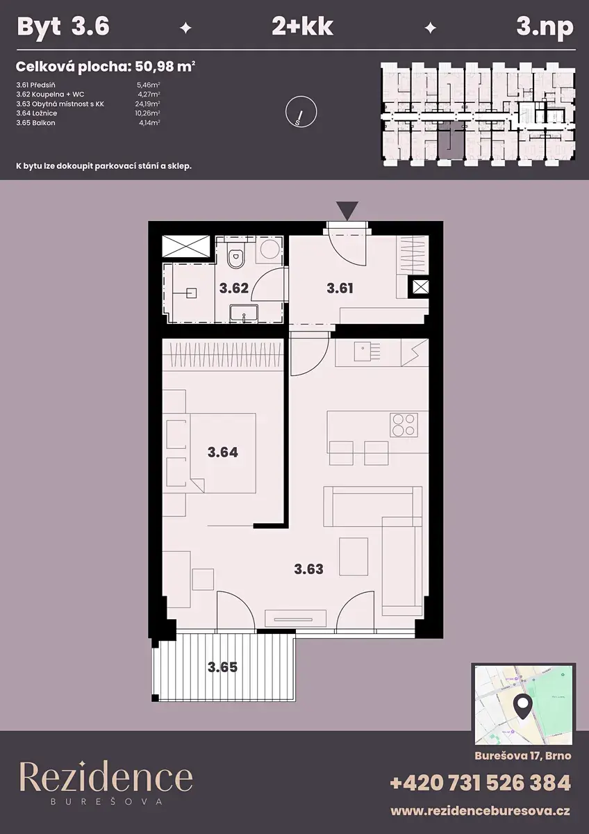 Nabízíme k prodeji moderní byt 2+kk o podlahové ploše 47,10 m2 s balkonem 4,10 m2 nacházející se v námi připravovaném projektu Rezidence Burešova v atraktivní lokalitě Veveří. Byt se nachází ve 3.NP, orientace bytu do ulice, severní strana. K bytu lze koupit parkovací místo v zakladači i sklad.