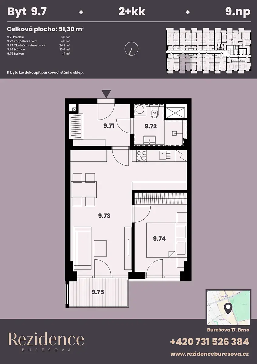 Nabízíme k prodeji moderní byt 2+kk o podlahové ploše 47,20 m² s balkonem o velikosti 4,10 m², který je součástí připravovaného projektu Rezidence Burešova v atraktivní brněnské lokalitě Veveří. Byt se nachází v 9. NP, je orientován do ulice na severní stranu. K bytu lze dokoupit parkovací místo v zakladači i sklepní kóji.