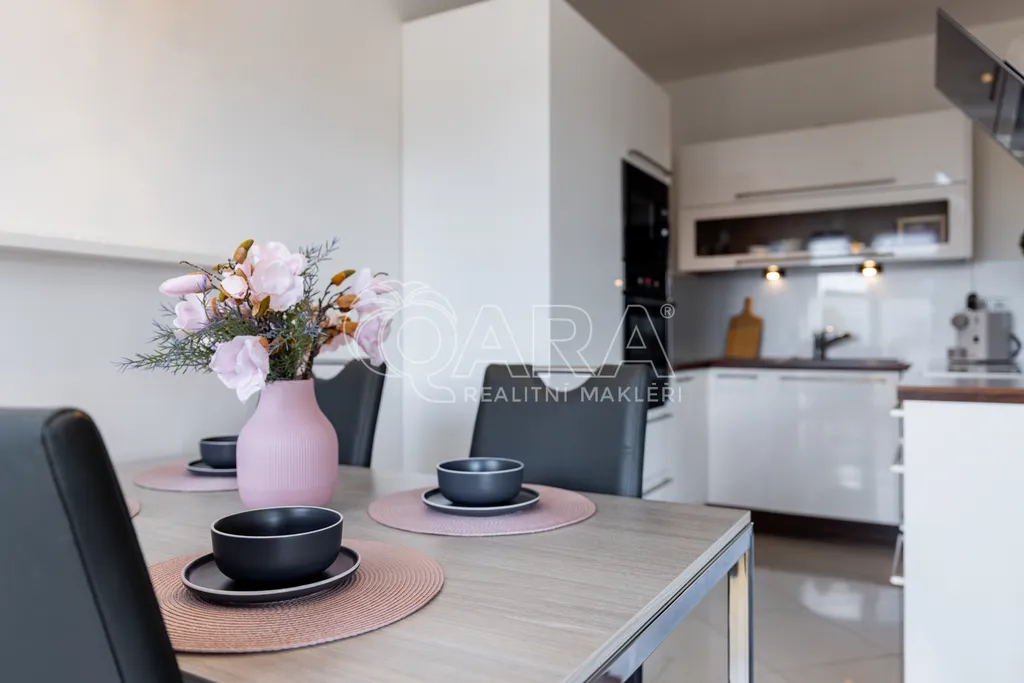 Dominantou bytu je pohodlná obývací část o téměř třiceti metrech čtverečních s plně vybavenou elegantní kuchyní a jídelním koutem.