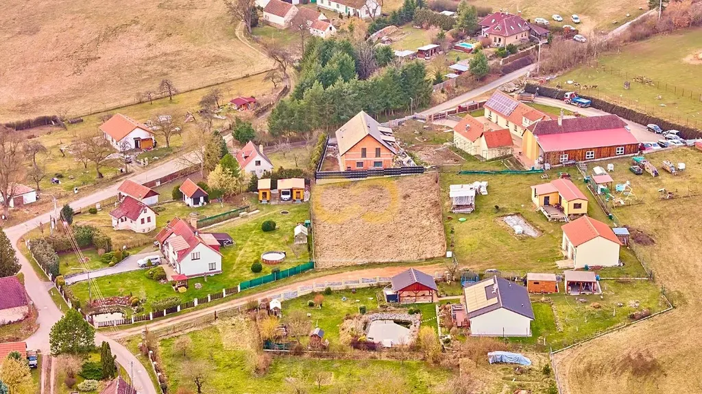 Elektřina je přivedená na hranici pozemku a plyn vede u příjezdové cesty. Vodu vyřešíte vlastním vrtem a jeho umístění je na pozemku už vytipované. Kanalizace je schválená a bude se budovat – než bude hotovo, můžete odpad stejně jako sousedé vyřešit jímkou. K pozemku patří spoluvlastnický podíl na příjezdové cestě.