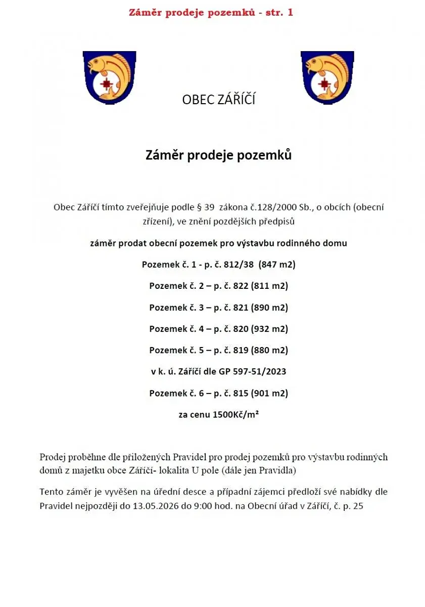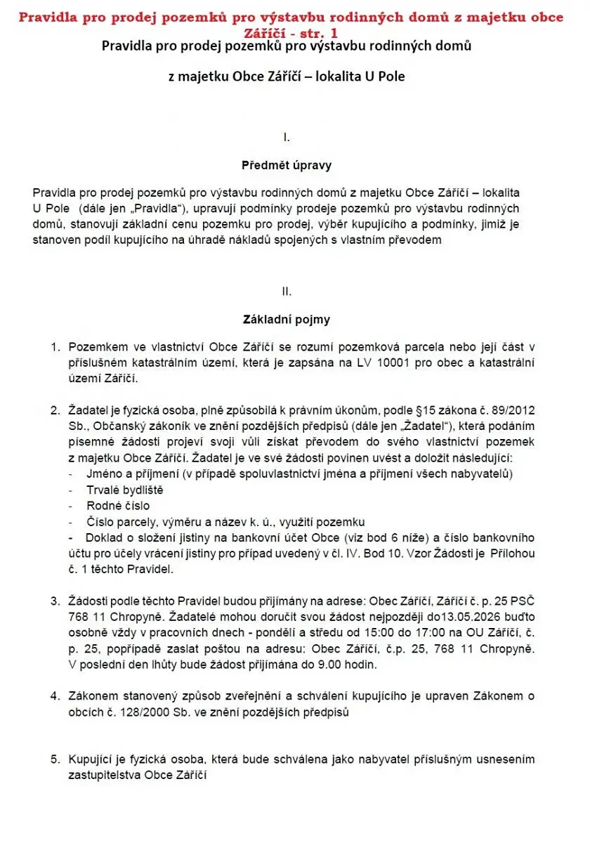 Sdělení stavebního úřadu k výstavbě naleznete v příloze č. 4 Pravidel pro prodej pozemků pro výstavbu rodinných domů z majetku obce Záříčí - lokalita U Pole.