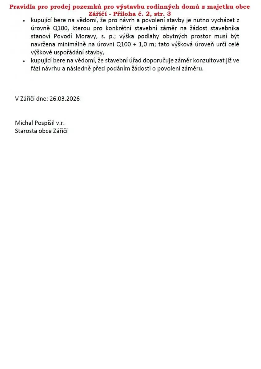 - kupující bere na vědomí, že pro návrh a povolení stavby je nutno vycházet z úrovně Q100, kterou pro konkrétní stavební záměr na žádost stavebníka stanoví Povodí Moravy, s. p.; výška podlahy obytných prostor musí být navržena minimálně na úrovni Q100 + 1,0 m; tato výšková úroveň určí celé výškové uspořádání stavby,