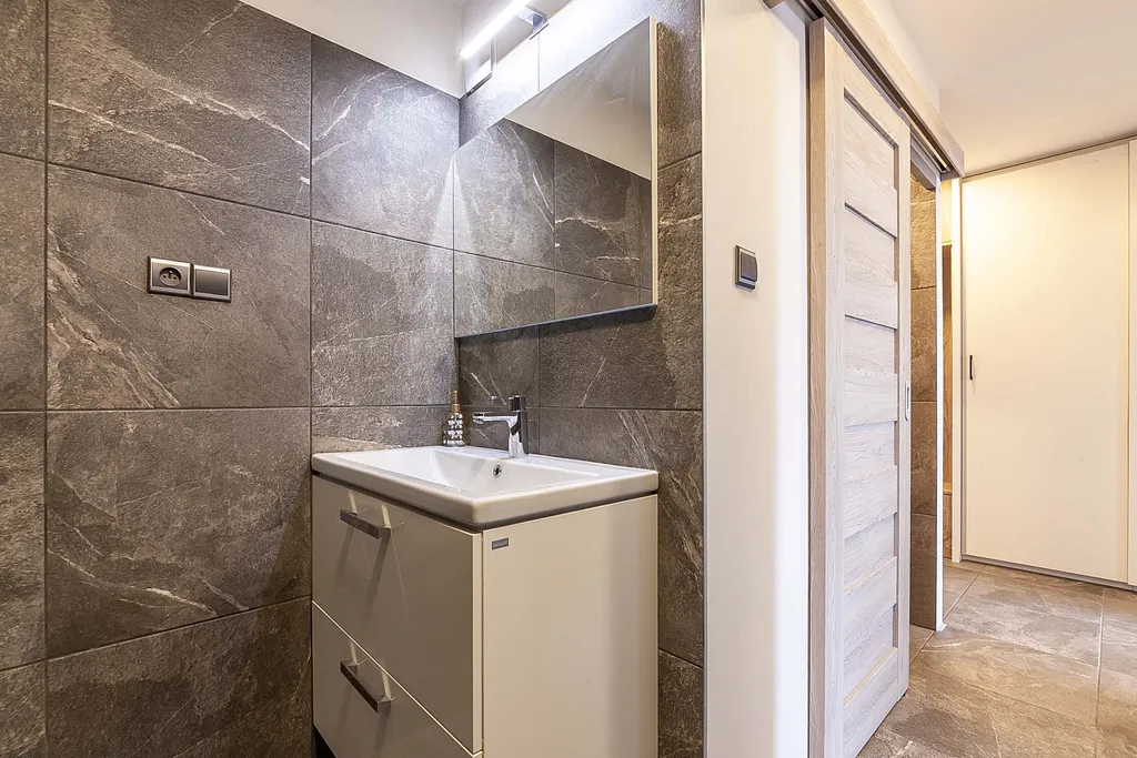 • Chytře využitý prostor: Díky posuvným dveřím do všech místností působí byt vzdušně. V předsíni najdete velkou šatní skříň.