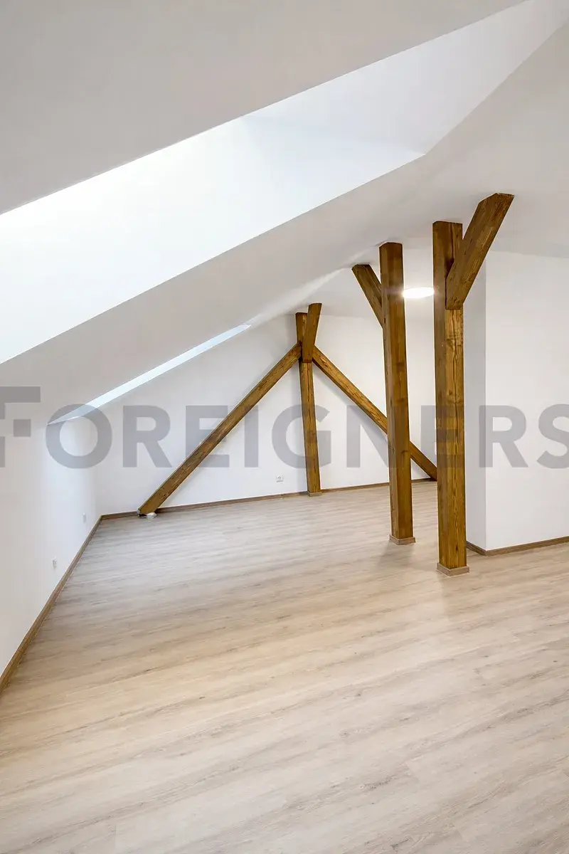 Nabízíme k pronájmu světlý byt o dispozici 1+kk a celkové ploše 50 m² s prostornou terasou 12 m², který vznikl jako novostavba vybudovaná z půdního prostoru.