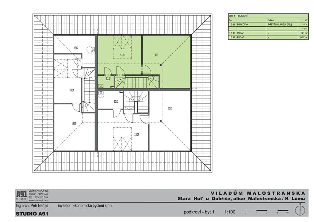 Dispozice bytu nabízí v 1NP prostorný obývací pokoj s kuchyňským koutem o výměře 28m2, schodiště do 2NP, přímý vstup na terasu a zahradu o rozloze 178m2, koupelnu se sprchovým koutem 5m2, komoru 1m2 a vstupní chodbu 5m2. Ve 2NP naleznete 2x pokoj 12m2 a 20m2, samostatnou koupelnu 6m2, samostatné wc 1m2, chodbu 10m2 a schodiště do 3NP, zde naleznete pracovnu 13m2, a 2x půdní prostory plně pochozí o celkové výměře 21m2 s možností vybudování wc s umyvadlem i sprchovým koutem.
