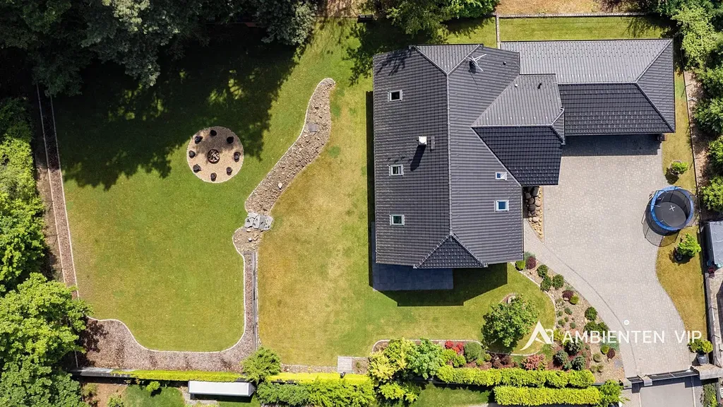 V přízemí domu se nachází samostatná garáž s průchodem do technické místnosti a následně do předsíně s vestavěnými skříněmi. Z předsíně se poté dostaneme do prádelny, koupelny s toaletou, posilovny a zejména úchvatného obývacího prostoru s kuchyňským koutem s krbem a jídelnou. Z obývacího prostoru je přímý výstup do zahrady skrze francouzská okna. V 1. patře domu se nachází pokoj pro hosty, ložnice, dva dětské pokoje, pracovna, šatna, samostatné wc a koupelna se sprchovým koutem, vanou a toaletou.