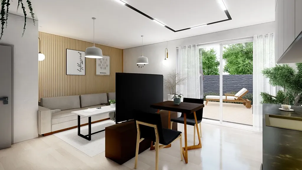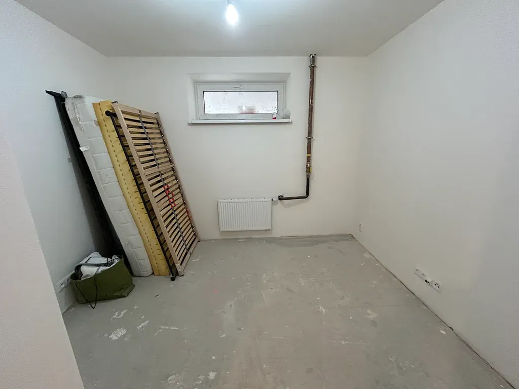 Obývací pokoj s kuchyňským koutem (22m2) , ložnice (12m2), koupelna se sprchovým koutem a WC, chodba. Vytápění a ohřev TUV - plynový kotel umístěný v koupelně. Sklepní kóje v 1.PP. K bytu náleží parkovací stání u domu a dvorek.