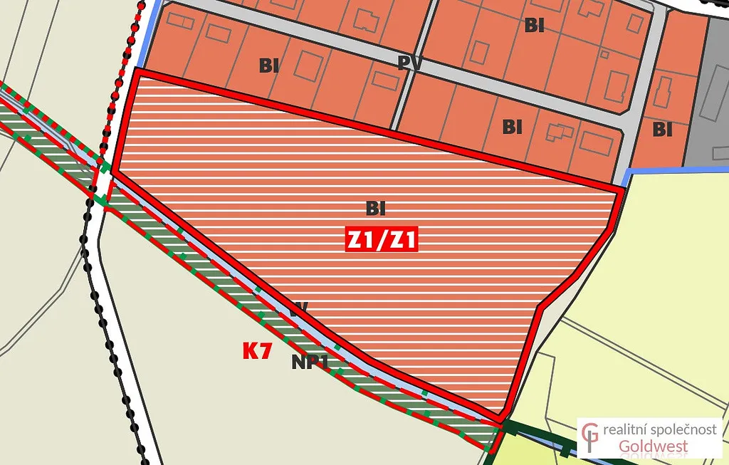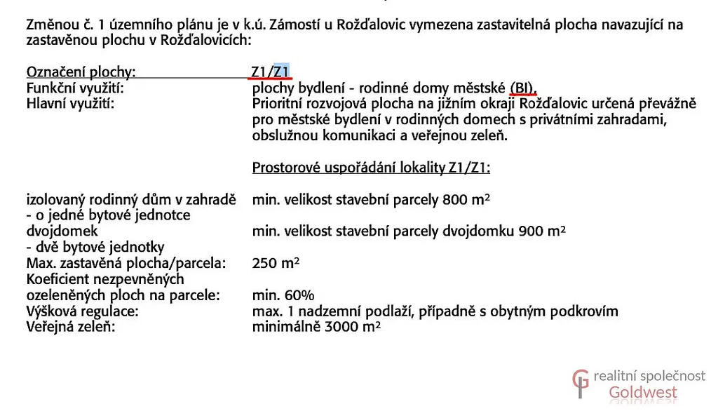 Dle územního plánu je určený k zástavbě a označený Z1/Z1 (BI). - plochy bydlení městské v rodinných domech s privátními zahradami, max. 1 nadzemní podlaží, případně s obytným podkrovím. Zastavěnost pozemku 250 m², koeficient nezpevněných ozeleněných ploch min. 60%, možnost stavby i dvojdomu na parcelách o min. velikosti 900 m².