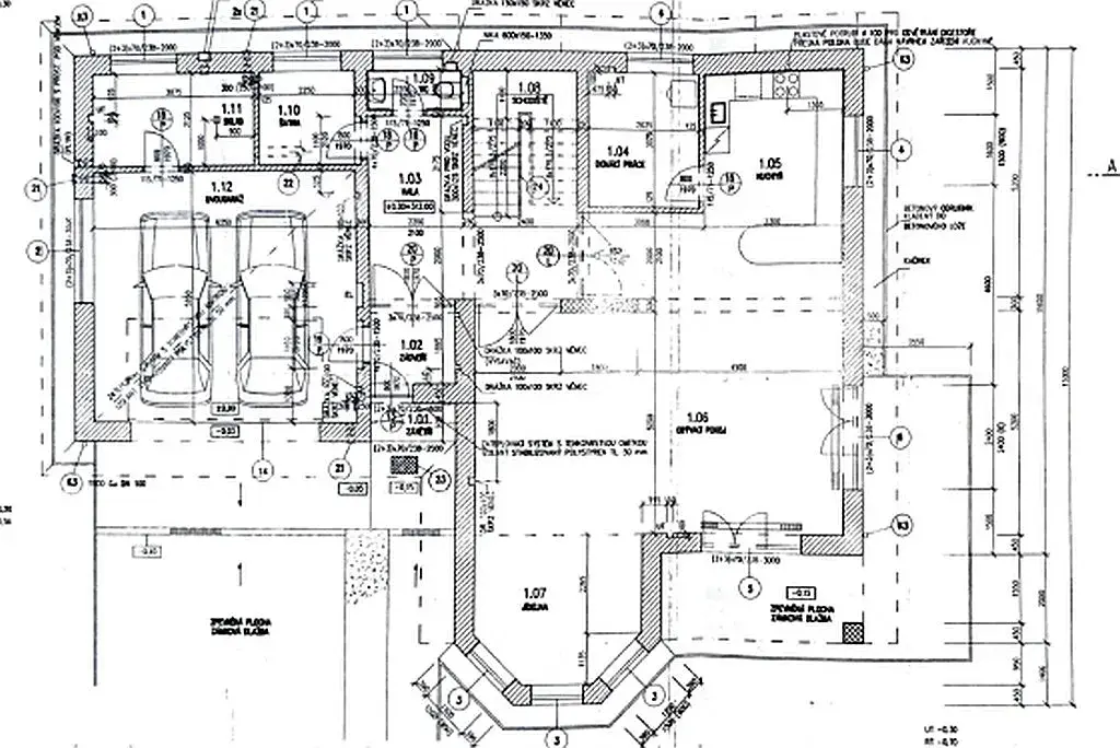 V přízemí se dále nachází pokoj, který může sloužit jako pracovna nebo pokoj pro hosty, prostorná vstupní hala, samostatná toaleta, šatna a pod schodištěm praktický uzavíratelný prostor pro pračku a sušičku. Velká garáž pro dvě auta je doplněna o technické místnosti.