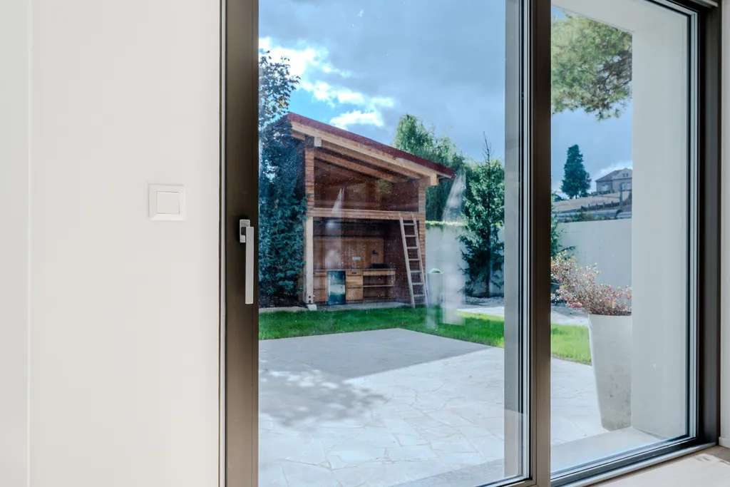 Zahrada je navržena jako plnohodnotný obytný prostor s venkovní kuchyní vybavenou varnou deskou, grilem a lednicí – ideální pro letní večery i každodenní využití.