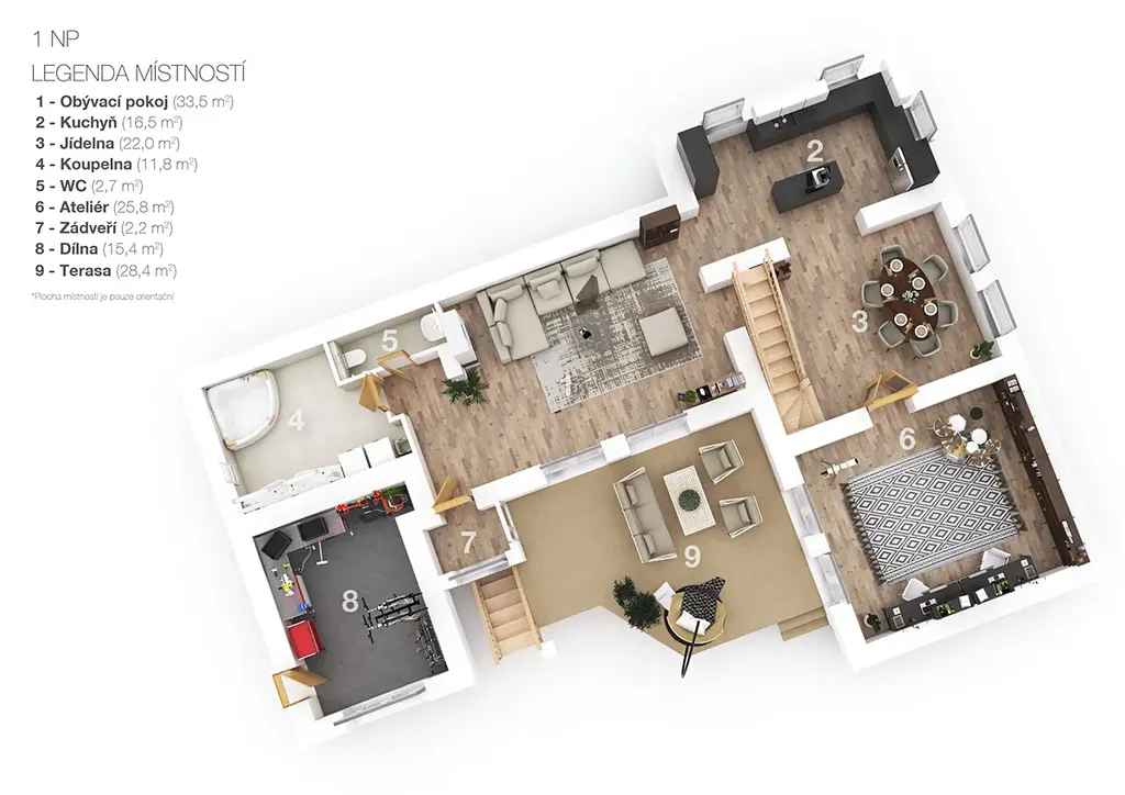 Dispozice v přízemí zahrnuje příjemný propojený prostor s obývacím pokojem, kuchyňským koutem, jídelnou a halou. Vzdušnosti přispívají vysoké stropy 2,85 m. Dále je zde velká koupelna, samostatné WC a chodba. Samostatně je pak přístupná dílna. V patře jsou z chodby přístupné 4 pokoje a koupelna se záchodem. Ve sklepě je jak technické zázemí, tak úložné prostory. Stavba umožnuje jak komfortní bydlení pro větší rodinu, tak např. kombinaci bydlení s podnikáním či provozovnou.