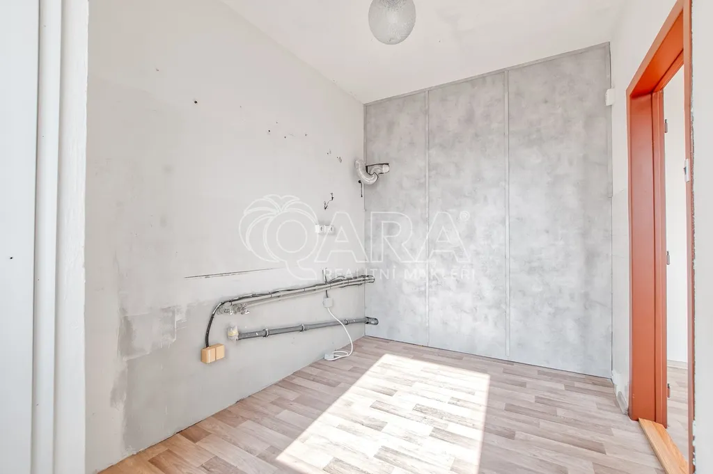 Kuchyňská linka je zde už odstraněná. Díky tomu vás nečeká žádné bourání staré plechové klasiky, která se v těchto bytech často objevuje a rozvody vody jsou připravené v plastu, takže máte o kus práce méně a můžete rovnou řešit finální podobu podle sebe.