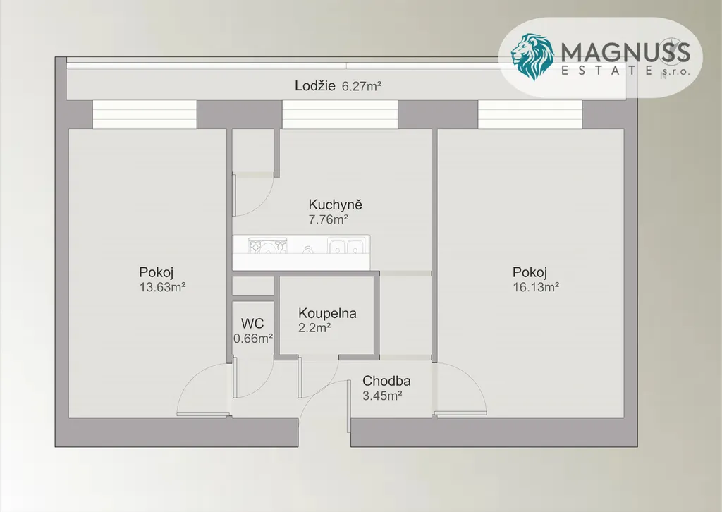 Byt disponuje velmi příjemným a praktickým dispozičním řešením s dostatkem denního světla. Dominantou je prostorná lodžie o velikosti cca 9 m², na kterou je vstup z obou pokojů – ideální místo pro relaxaci s výhledem do okolí.