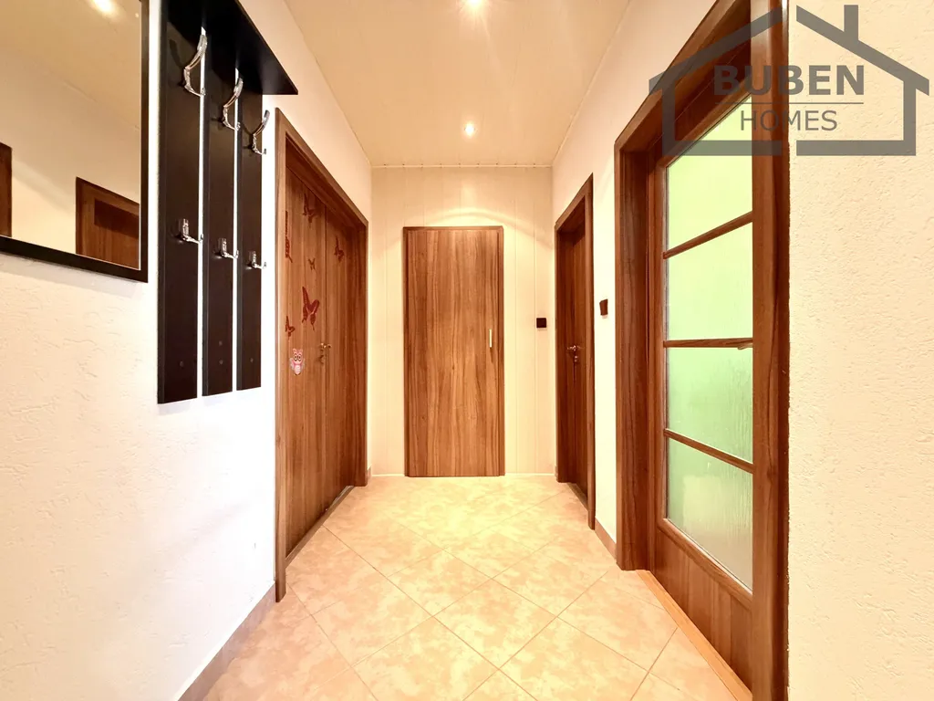 Byt tvoří prostorná chodba, kuchyň, jídelna, obývací pokoj, dvě ložnice (jedna se vstupem na lodžii), koupelna s vanou a samostatné WC a komora sloužící jako šatna.