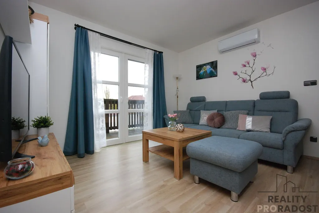 Dispozice: vstupní chodba s věšákovou stěnou a vestavnou šatní skříní, obývací pokoj se vstupem na prostornou terasu, kuchyně s kuchyňskou linkou a místem na jídelní stůl, ložnice s postelí a vestavnou šatní skříní, koupelna se sprchovým koutem, umyvadlem a pračkou a samostatné WC.