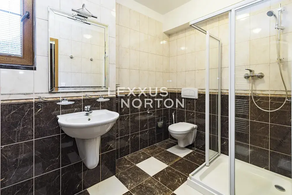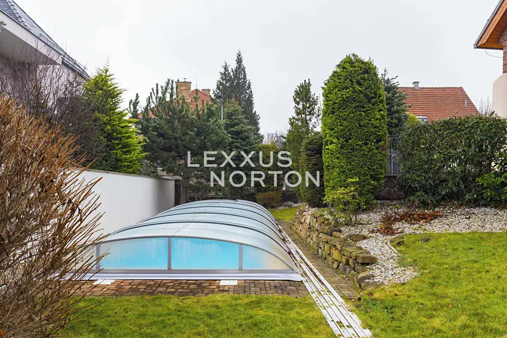 Vila 9+1 k pronájmu s vyhřívaným bazénem a saunou disponuje prostornou vstupní chodbou, obývacím pokojem s jídelní částí, samostatnou plně vybavenou kuchyní se vstupem na terasu a toaletou pro hosty. Ve 2. nadzemním podlaží se nachází dvě prostorné haly, šest ložnic, dvě plně vybavené koupelny, prádelna a dva balkony. K domu náleží garáž pro dvě vozidla a krásná udržovaná zahrada o ploše 670 m2.