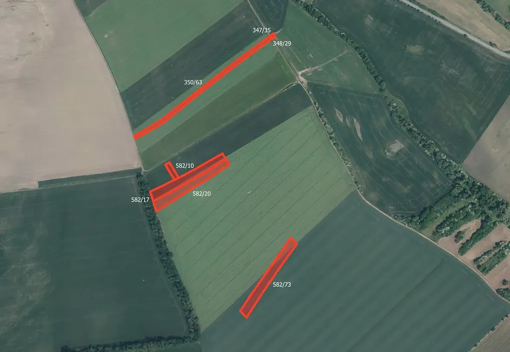 Celková výměra všech pozemků činí 55 410 m², z čehož prodávaný podíl představuje 18 470 m². Z toho:
