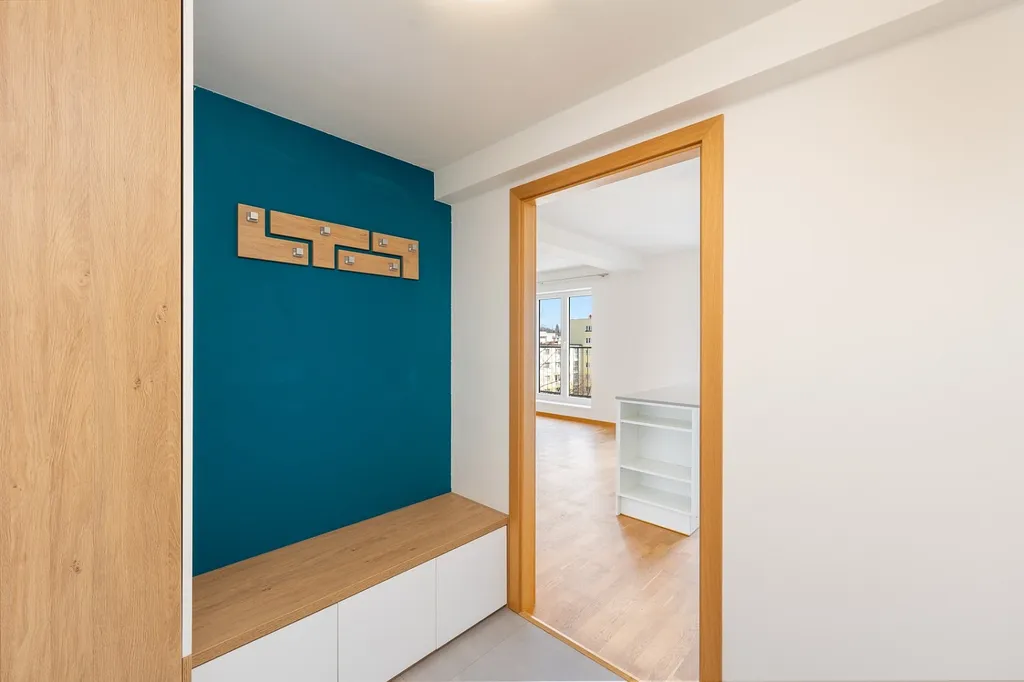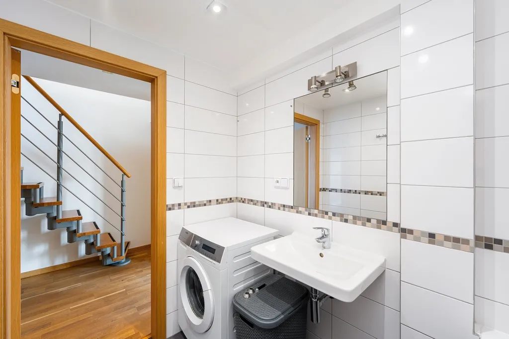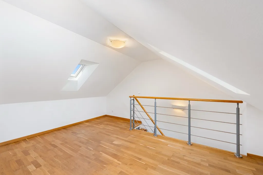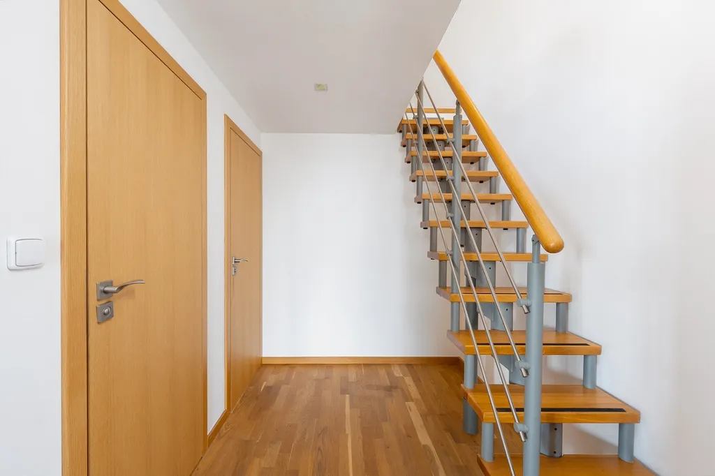 Spodní patro tvoří prostorný obývací pokoj s kuchyňským koutem (31,6 m²), koupelna a praktické zádveří, které řeší úložné prostory. Díky tomuto rozdělení se v bytě nebudete cítit stísněně a získáte jasné oddělení denní části od soukromí.