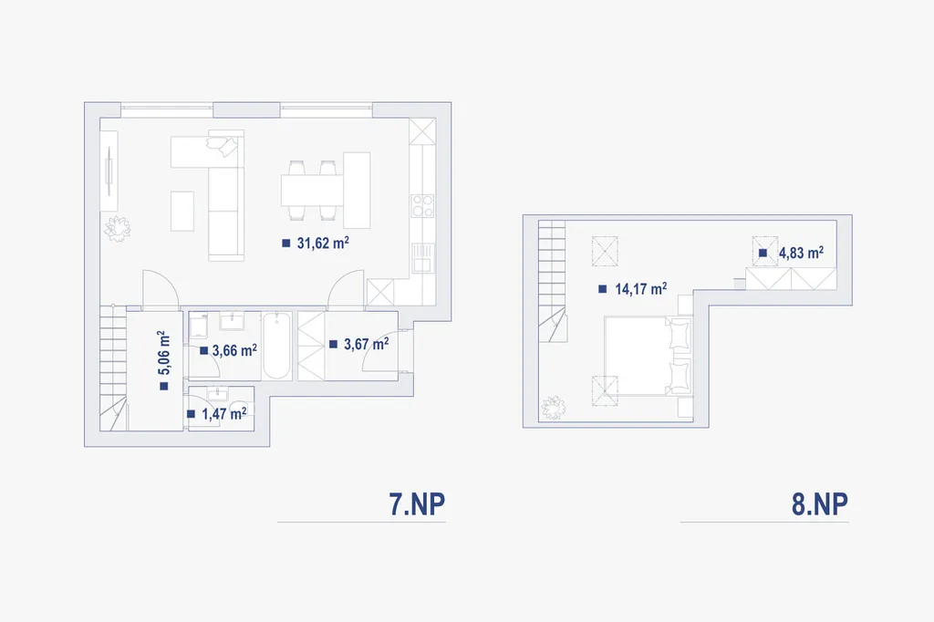 Dispozice tohoto bytu nabízí vzdušný obytný prostor s přirozeným oddělením denní a klidové části díky galerii v horním patře, která slouží jako ložnice či pracovní kout.