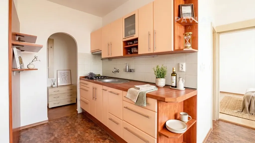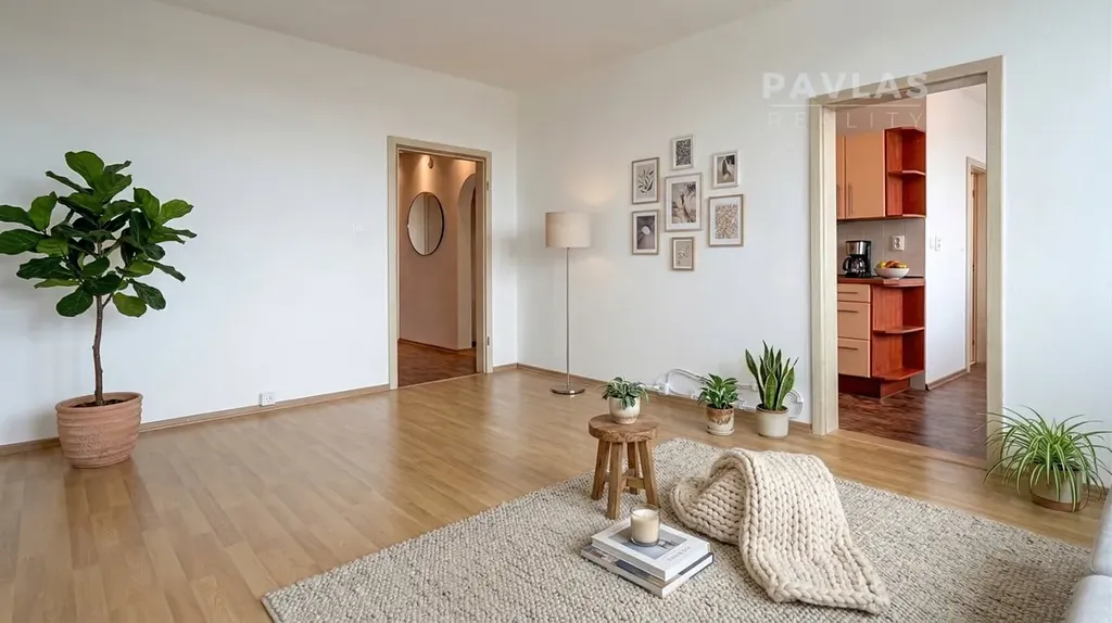 Vnitřní uspořádání bytu je řešeno velmi prakticky. Srdcem domova je světlý obývací pokoj, dvě samostatné neprůchozí ložnice, kuchyně s dostatkem prostoru i pro jídelní stůl, a koupelna s vanou. Výrazným benefitem interiéru je zabudovaná prostorná šatna, která zajišťuje dostatek úložných prostor a přispívá k čistému, vzdušnému dojmu z celého bytu.
