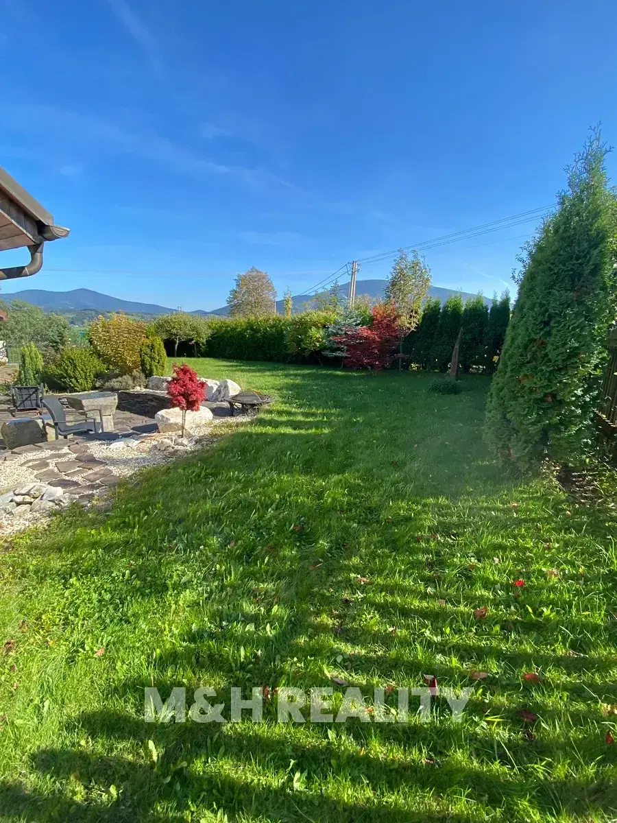 Dovolujeme si Vám nabídnout dům 6+kk s otevřenými výhledy na golfové hřiště Čeladná v Kunčicích pod Ondřejníkem, kde stačí přejít cestu a jste v Čeladné. Někdy jsou hranice na mapě jen čáry a toto místo má své kouzlo. Dům je situován v chráněné krajinné oblasti Beskydy, obklopen přírodou, výhledy a klidem což Vás určitě nadchne. Ve skutečnosti budete žít přesně tam kde chcete –na prestižní hraně obou světů. Lokalita domu je naprosto unikátní. Jaro a léto jsou zde bez nadsázky rájem-zeleň, ticho, horský vzduch a panorama, které Vás nikdy neomrzí. Podzim Vás okouzlí svou pestrobarevností a zima je tady jako z pohádky. Je to dům který má atmosféru. Zastavěná plocha a nádvoří 162m2, plocha pozemku 967m2, celková plocha pozemku 1.129m2. Podlahová plocha 218m2, užitná plocha 218m2.Dům s dispozicí 6+kk má dvě podlaží. Dům byl kolaudován v roce 2008 přičemž v posledních letech proběhla modernizace byl vyměněn plynový kotel, nový bojler, vlastní PB zásobník ( doplnění cca 1x za 14 měs.), jímka 27m3, vlastní studna, na hranici pozemku se nachází vodovodní obecní řád. Měsíční náklady elektřina 2.500,-Kč., plyn 3.000,-Kč. Energetická náročnost budovy třída B. Hlavní garáž umožňuje vjezd do druhé, vnitřní garáže, ideální pro druhý vůz, dílnu atd. Další úložné prostory jsou nad garáží v podkroví. Interiér domu Vás překvapí vstupní halou s krbem-místem kde odložíte nejen kabát, ale i starosti dne. Srdcem domu je velkorysý obývací pokoj propojený s kuchyní a přímým vstupem na terasu, odtud sledujete svahy přírodní rezervace Kněhyně a horské hřebeny v dálce. Dispozice domu nabízí tři ložnice v patře, útulný pokoj v podkroví, multifunkční místnost v přízemí (pro wellness, tichou pracovnu atd.)Bezproblémové bydlení, soukromí bez izolace, soukromí na pozemku pro relax bez náročné údržby, klid a respekt k soukromí je samozřejmostí. Pokud Vás tato nabídka s nejluxusnějšími výhledy zaujala, neváhejte nás kontaktovat a domluvte si prohlídku.
