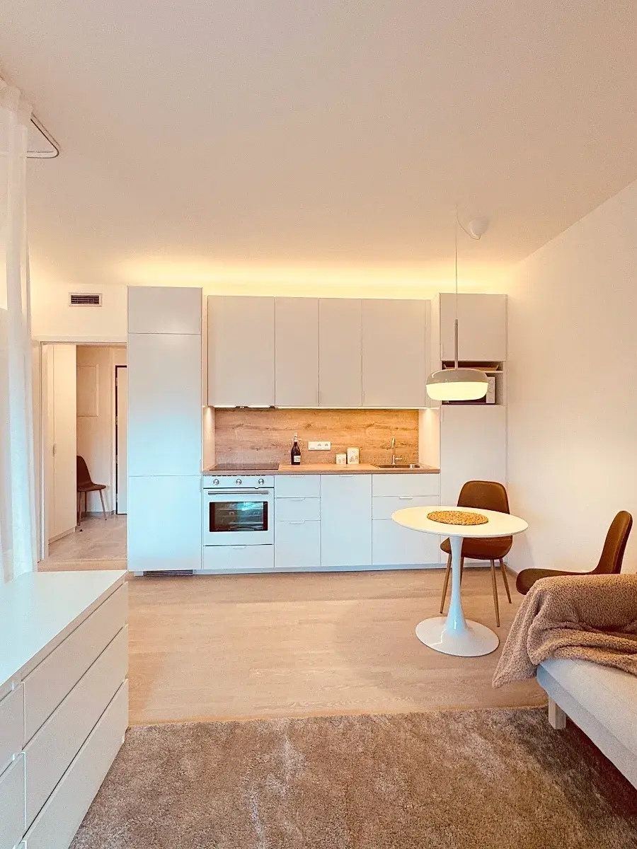 Atraktivní nabídka pronájmu velmi hezkého zařízeného bytu 1+kk/balkon/sklep (celkem 50 m2) s garážovým stáním, Praha 4 - Modřany, ul. Mezi vodami. Příjemný a útulný byt je součástí nové výstavby bytového projektu "Zahálka", který vyrostl na klidném místě v pražské čtvrti Modřany v blízkosti řeky Vltavy. Součástí velice vkusně zařízeného bytu o ploše 35 m2 je prostorný obývací pokoj s kuchyňským koutem (25 m2) a s výstupem na balkon (10 m2), předsíň (4,5 m2) a koupelna se sprchovým koutem, umyvadlem a toaletou (5,5 m2). K dispozici je jedno garážové stání a zděná sklepní koje o ploše 5 m2 v suterénu domu. Byt je sice umístěný v přízemí bytového domu s výtahem, který je ale ve svahu, okna s balkonem jsou tedy 10 metrů nad úrovní země. Byt je kompletně zařízený včetně kuchyňské linky se všemi spotřebiči (el. trouba, indukční varná deska, mikrovlnná trouba, odsavač par, lednice a mrazák). Orientace oken a balkonu jsou na severozápad. Součástí bytového areálu jsou kavárny, supermarket, fitness centrum a další služby. V docházkové vzdálenosti je stanice tramvají směr centrum Prahy a dále autobusové spojení k metru trasy B – Smíchovské nádraží. Sportovní nadšenci ocení přilehlou cyklostezku směr Výtoň a Zbraslav. Složená jistota činí 60 000 Kč. Budoucí nájemce neplatí provizi. PENB A.