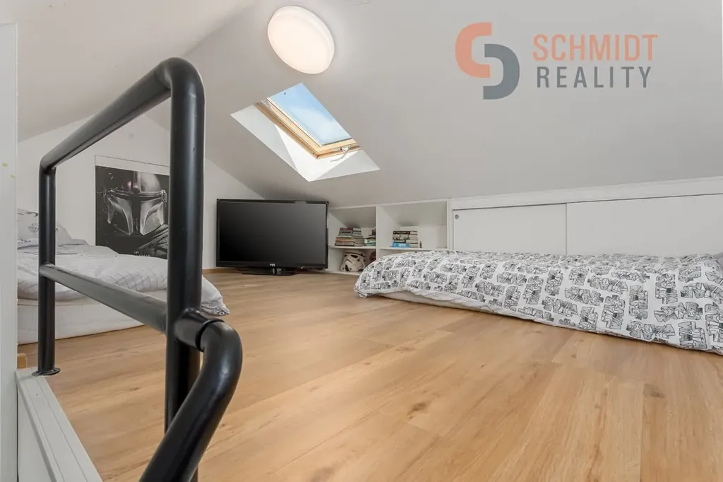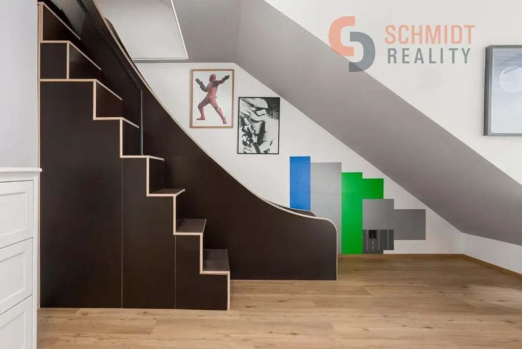 Velkým benefitem je originálně řešený dětský pokoj (21,61 m²) s podkrovní částí (13,73 m²), kterou lze využít jako další samostatný pokoj. Tato část bytu nabízí hravý a zároveň praktický prostor pro děti, včetně skluzavky s úložným prostorem, jež dodává interiéru jedinečný charakter.