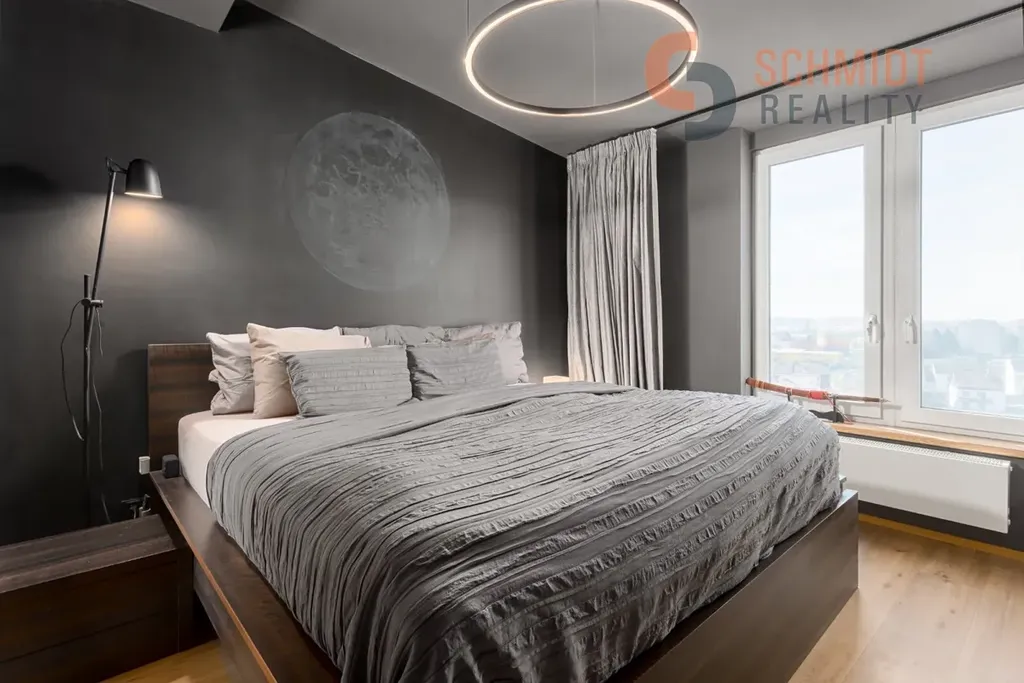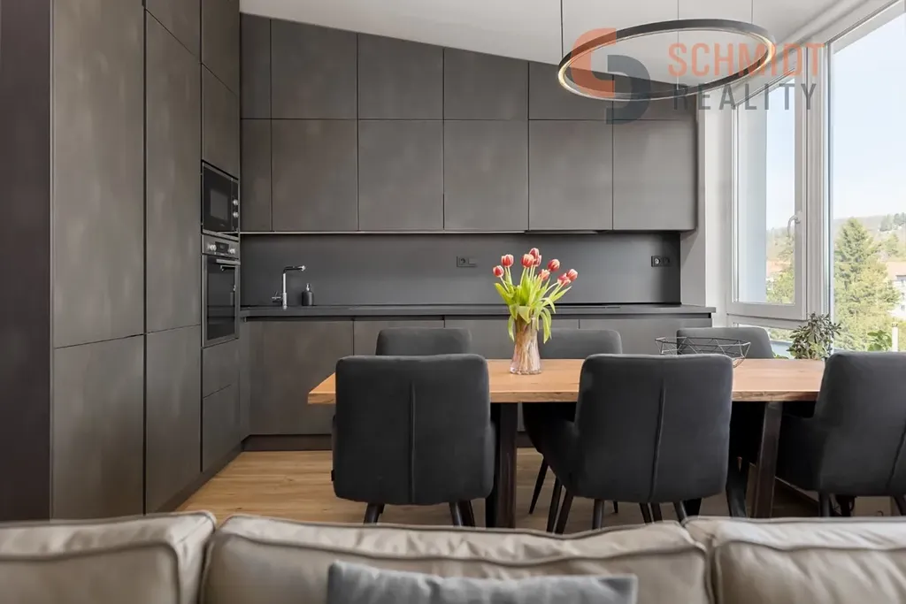 Dominantou bytu je otevřený obytný prostor s kuchyní a jídelní částí (42,47 m²), který tvoří přirozené centrum celého domova. Luxusní kuchyňská linka vyrobená na míru podtrhuje celkový nadstandard nemovitosti a nabízí dostatek prostoru i pro náročnější vaření. Celý prostor je velmi moderní, prosvětlený a působí harmonickým dojmem.