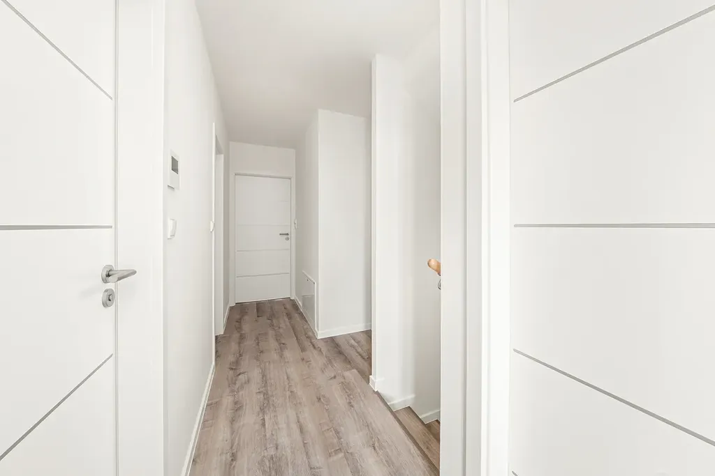 Byt je dokončený po kolaudaci, je provedena příprava pro kuchyňskou linku, hotové koupelny včetně sanity, dlažby, interiérové dveře, rekuperační jednotka, podlahové vytápění, plastová okna. V ceně bytu je vinylová podlaha, možnost vlastního výběru s případným doplatkem rozdílu ceny za m².