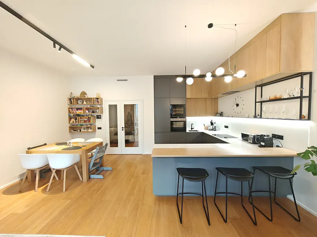 Interiér zaujme nadstandardní výškou stropů 3,05 m, která bytu dodává světlost a pocit vzdušnosti. Dispozice zahrnuje prostorný obývací pokoj s plně vybavenou kuchyní (včetně všech spotřebičů a vinotéky), samostatné WC pro hosty a koupelnu s vanou.