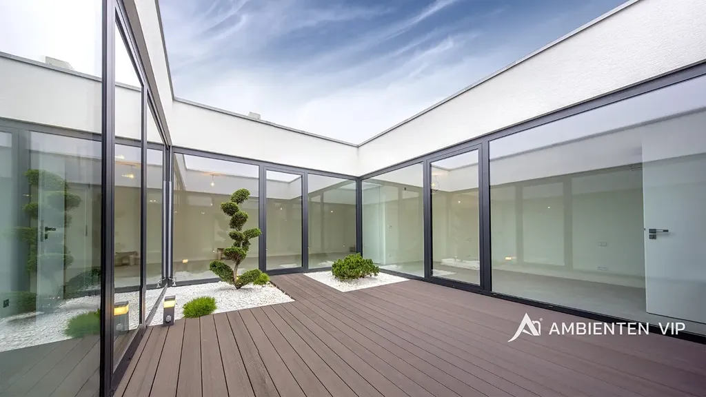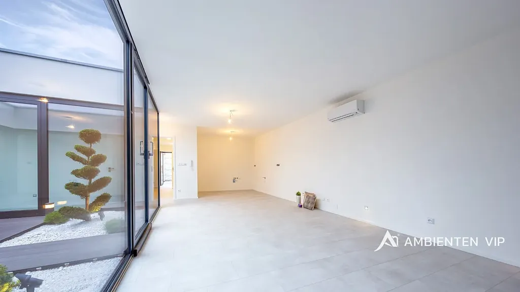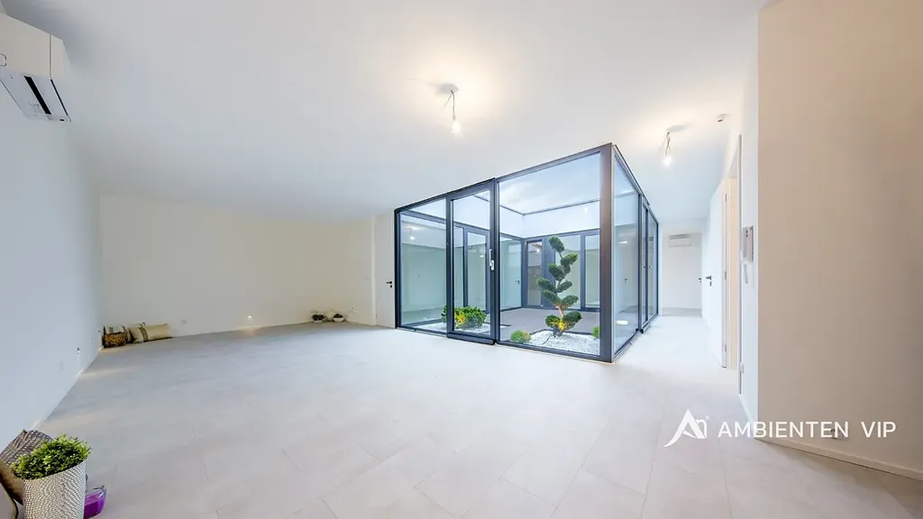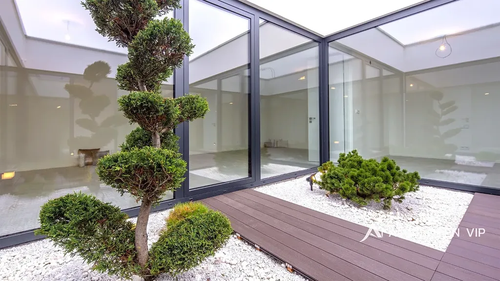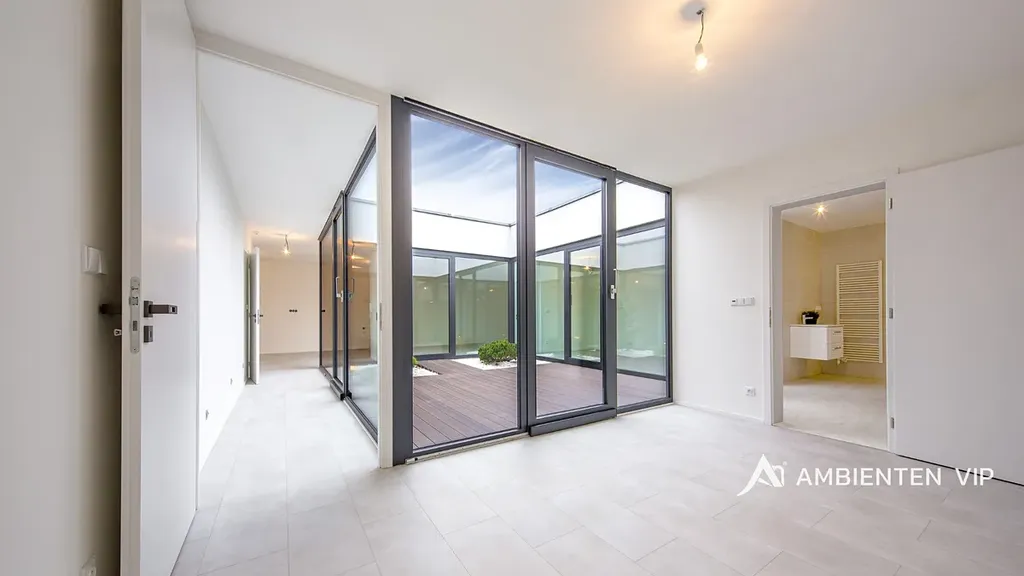 Nemovitost disponuje velkým obývacím pokojem s kuchyňským koutem o velikosti 45 m2. Kompletně vybavená kuchyňská linka bude vybudována panem majitelem před nástup do pronájmu. Z obývacího pokoje i z dalších dvou pokojů je přímý vstup do vnitřního proskleného atria s otevřenou oblohou (28m2) a je unikátní místem pro odpočinek, inspiraci či welness.