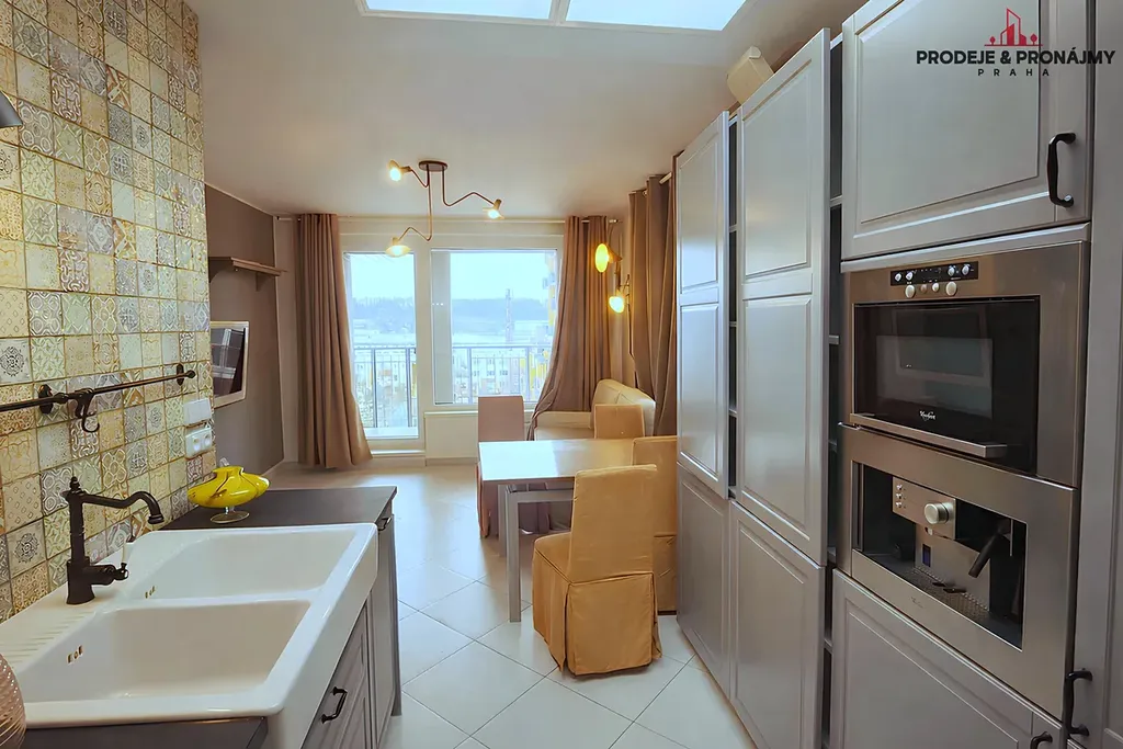 Objemná kuchyň je vybavena technikou Whirlpool: trouba, mikrovlnka, kávovar, myčka. Lednička Electrolux. Dvojitý dřez a umyvadlo Laufen, baterie Grohe.